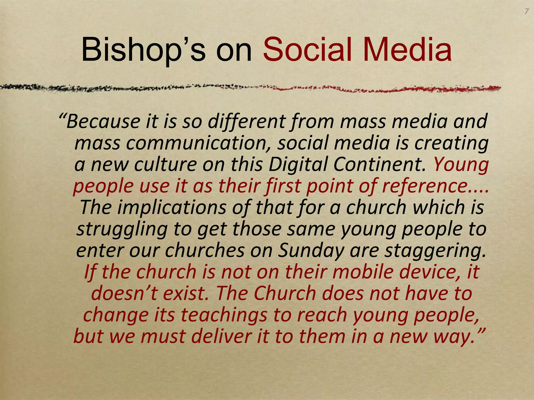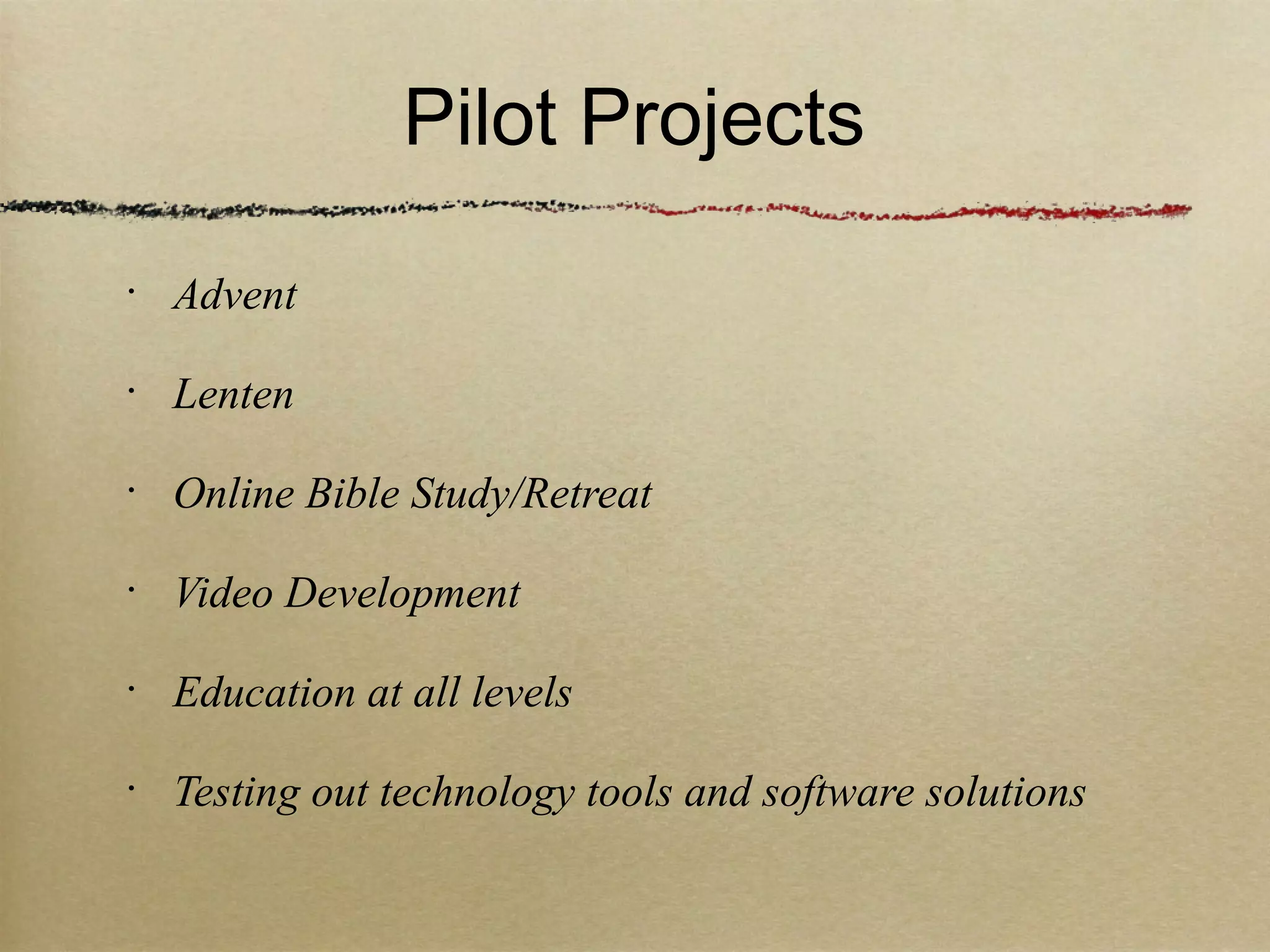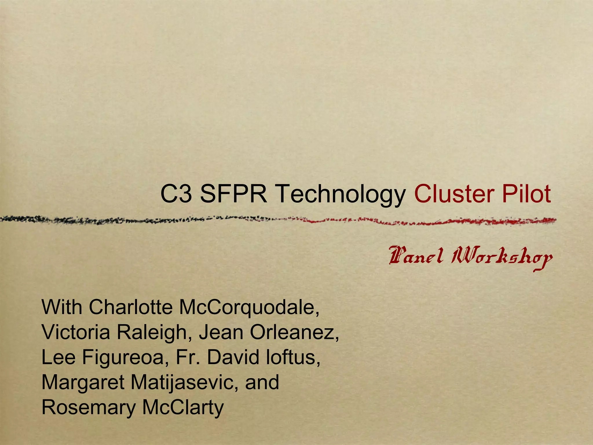 This document summarizes a workshop about a Catholic technology cluster pilot involving multiple parishes. The pilot aimed to 1) create a collaborative effort using technology, 2) cultivate strategic development of initiatives, and 3) utilize change management strategies. Parishes shared goals like training leaders in technology, assessing communication preferences, and developing databases. Pilot projects included social media outreach and online Lenten activities. Challenges included resistance to change, while success required staff development and curating online content. The workshop provided resources for parishes integrating technology.