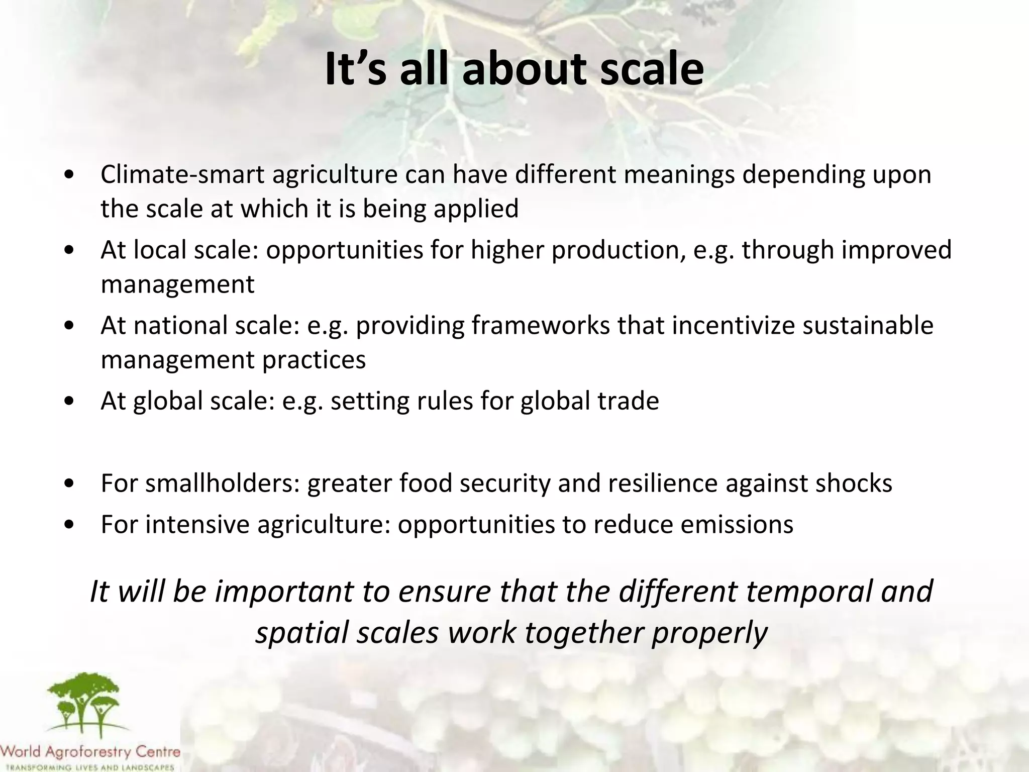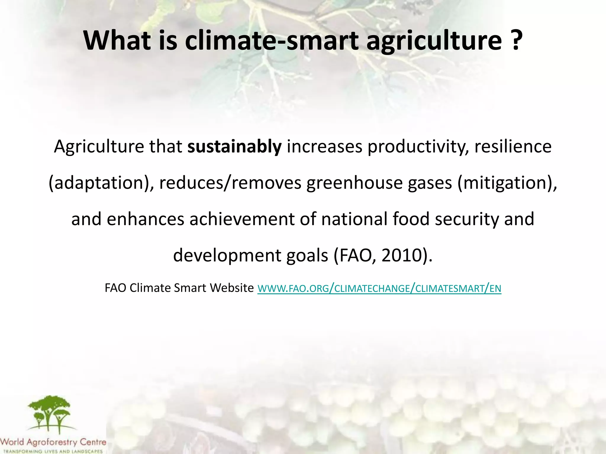 Climate-smart agriculture aims to sustainably increase productivity and incomes, adapt and build resilience to climate change, and reduce and/or remove greenhouse gas emissions. It involves adopting various agricultural practices at the local, national, and global scales that improve food security through higher yields while addressing climate change adaptation and mitigation. However, constraints like a lack of knowledge and training, insecure land tenure, and short-term losses versus long-term benefits can inhibit smallholders from adopting climate-smart practices.
