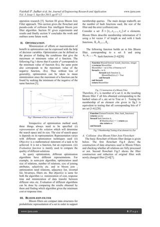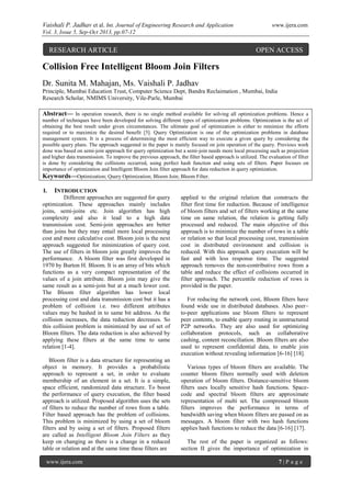 This document summarizes a research paper that proposes an intelligent Bloom join filter approach for query optimization. The approach uses sets of Bloom filters to represent relations and joining attributes, with the goal of minimizing collisions and maximizing data reduction. Experiments show that applying multiple filters increases the percentage of data reduction for relations when processing queries. The approach constructs filters for each joining attribute and applies existing or new filters to relations to reduce their size. This helps optimize query execution by reducing processing costs, data transmission costs, and collisions during joins.