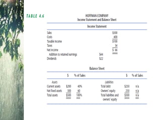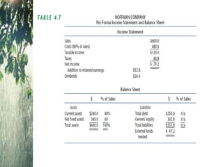 This document discusses long-term financial planning and growth. It covers elements of financial planning like investment decisions, capital structure decisions, and dividend policy decisions. It also discusses the financial planning process, including making assumptions and scenarios. The role of financial planning is to examine interactions between decisions, explore options, avoid surprises, and ensure internal consistency. The document provides examples of pro forma financial statements and how to calculate a company's internal growth rate and sustainable growth rate to determine how much a company can grow using internal financing versus requiring external financing.