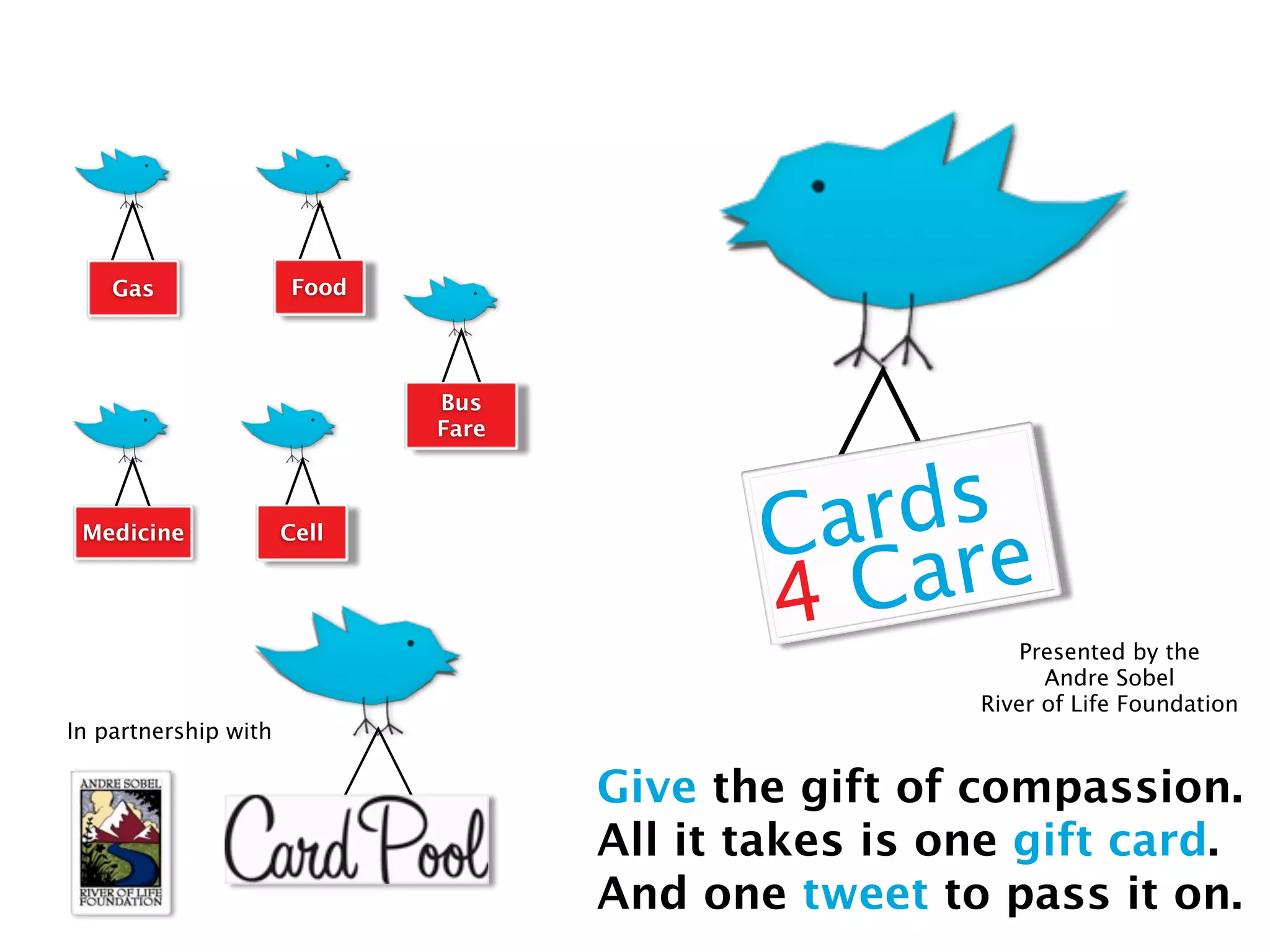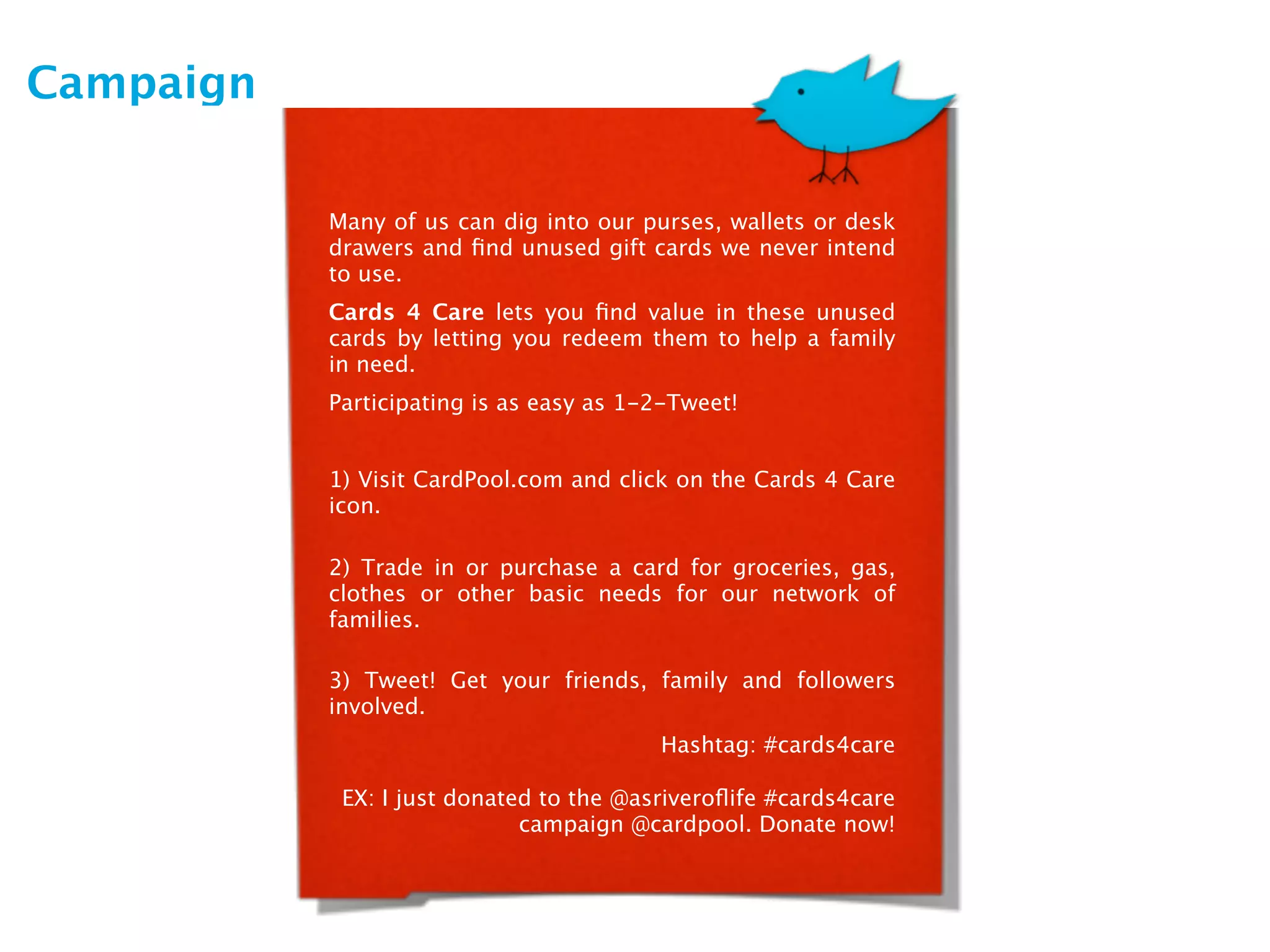 The Cards 4 Care campaign allows people to donate unused gift cards to help families in need. Participants can trade in or purchase gift cards on CardPool.com for groceries, gas, or other basic necessities. Donors are encouraged to tweet about their donation to spread awareness of the campaign. The donated gift cards benefit the Andre Sobel River of Life Foundation, which provides emergency assistance to caregivers of children with life-threatening illnesses.