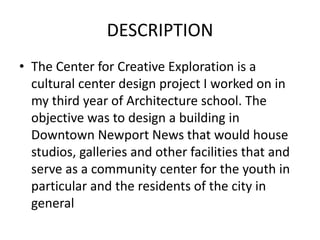 The Center for Creative Exploration is a cultural center design project for Downtown Newport News. It was intended to house studios, galleries and other facilities to serve as a community center for youth and residents of the city. The objective was to provide spaces that would support and encourage creative activities.