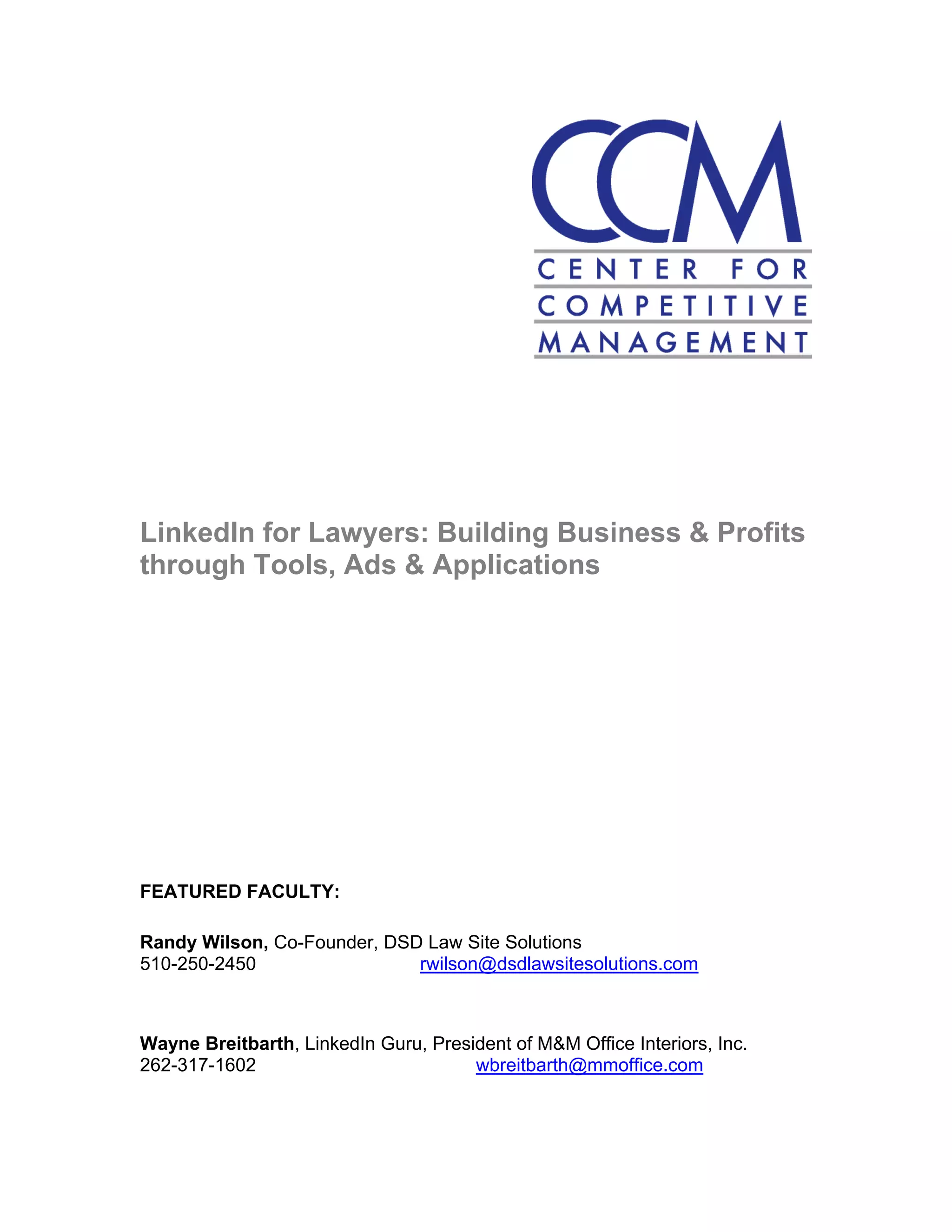 This document provides information about an upcoming audio conference titled "LinkedIn for Lawyers: Building Business & Profits through Tools, Ads & Applications". The conference will feature presentations from Randy Wilson, co-founder of a law firm marketing company, and Wayne Breitbarth, a LinkedIn expert. They will discuss how lawyers can effectively use LinkedIn to develop business, including what marketing tactics are allowed and how to build a professional presence on the site.