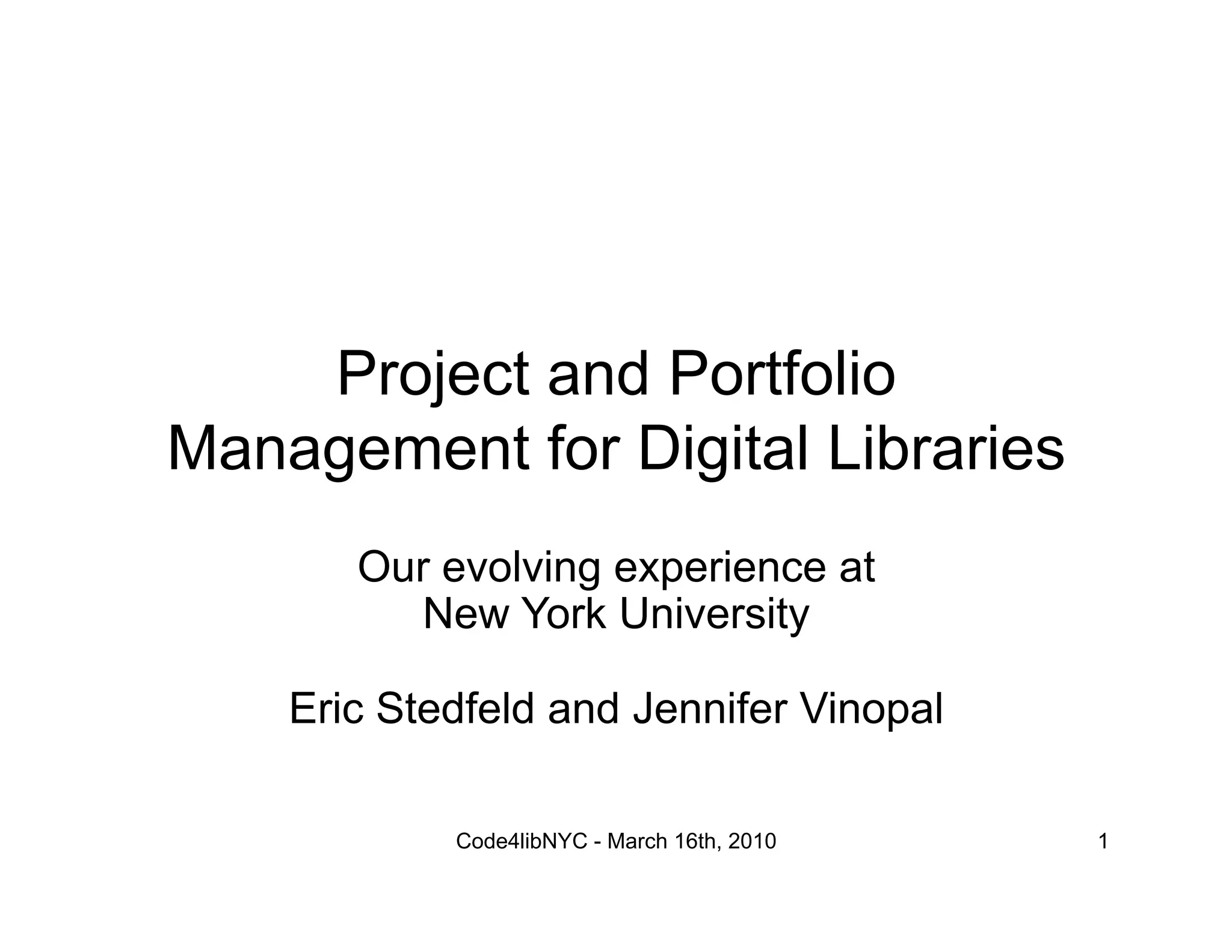 The document discusses project and portfolio management practices at New York University, particularly focused on digital libraries. It highlights the principles of project management, the project's life cycle, and the importance of tailoring processes to the organizational context. Key areas include the evolution from ad hoc approaches to more standardized processes and inquiries related to project management effectiveness.