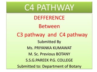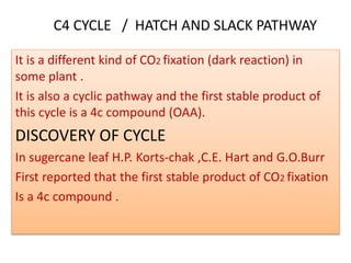 The document discusses the differences between C3 and C4 photosynthetic pathways, highlighting that C4 plants utilize a unique mechanism for CO2 fixation that occurs in both mesophyll and bundle sheath cells. It details the process of the C4 cycle, first identified by Hatch and Slack, where oxaloacetic acid is formed as the first stable product, adapting to high light and temperature in tropical regions. Additionally, the document outlines the anatomical differences, efficiency, and enzyme involvement in both cycles, emphasizing that C4 photosynthesis is more efficient at minimizing photorespiration compared to C3 photosynthesis.