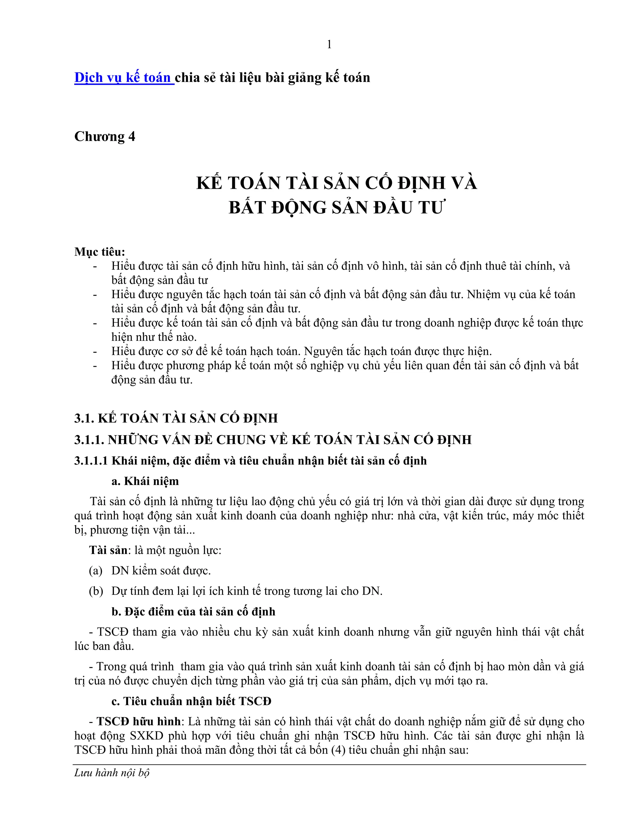 Tài liệu cung cấp kiến thức về kế toán tài sản cố định và bất động sản đầu tư, bao gồm khái niệm, đặc điểm, nguyên tắc hạch toán, và nhiệm vụ của kế toán trong quản lý các loại tài sản này. Nó phân loại tài sản cố định thành hữu hình và vô hình, đồng thời đề cập đến các tiêu chí ghi nhận và cách quản lý tài sản để đảm bảo hiệu quả kinh tế. Nội dung còn bao gồm nguyên tắc quản lý tài sản cố định, phân loại theo quyền sở hữu, nguồn hình thành và tình hình sử dụng.