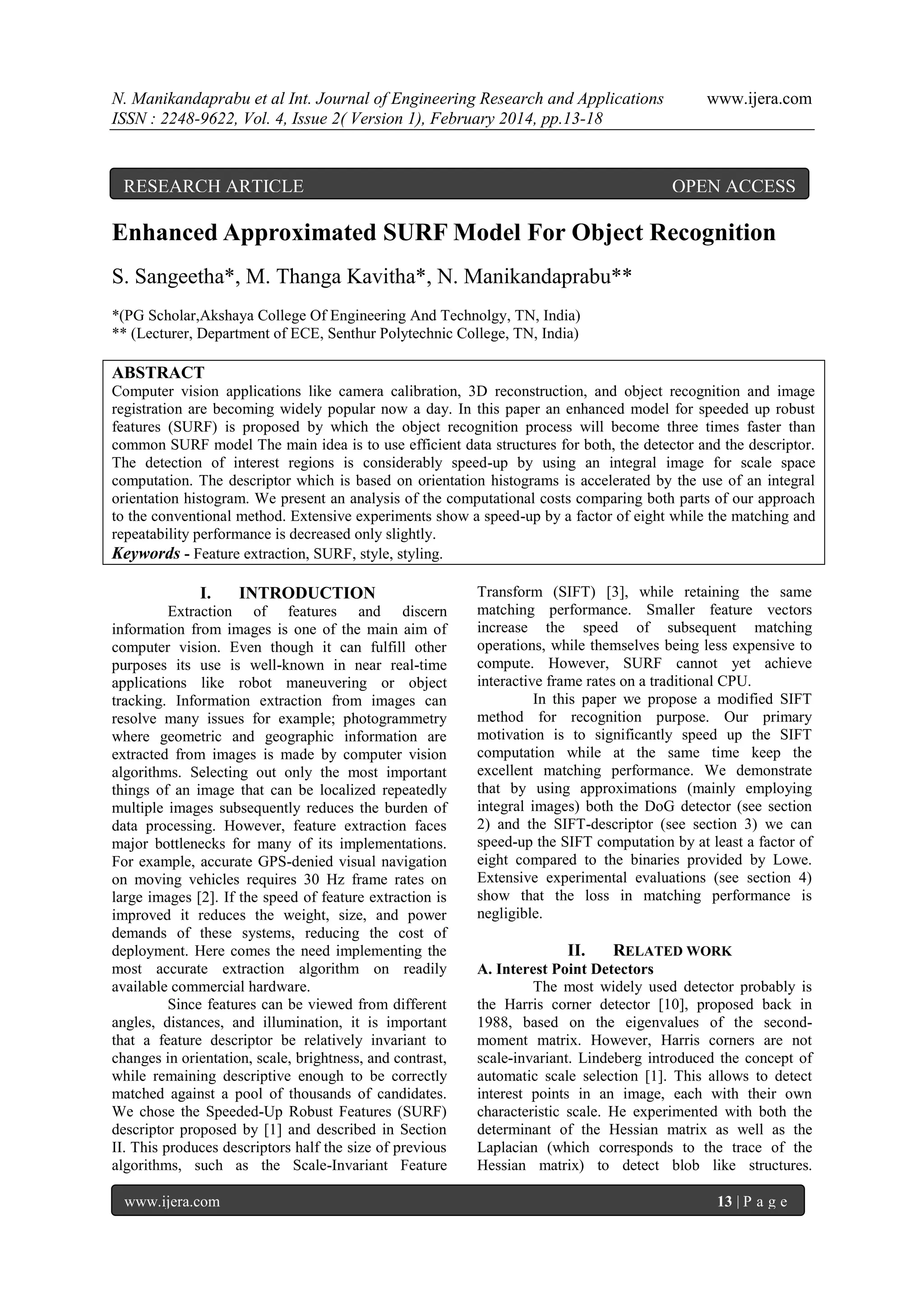 This paper presents an enhanced speeded-up robust features (SURF) model for object recognition, achieving a threefold speed increase compared to conventional models by utilizing efficient data structures and integral images. The proposed approach accelerates both interest region detection and descriptor computation while maintaining high matching performance, resulting in an overall speed-up factor of eight with minimal loss in accuracy. Extensive experiments and comparisons demonstrate the improvements over existing methods in feature extraction and image recognition applications.