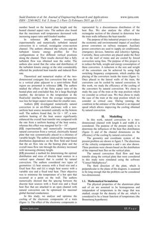 This document discusses a numerical analysis of natural convection cooling of electronic components mounted on an aluminum plate within the walls of a train. The study examines the effect of a discontinuous heat flux distribution from the components on heat transfer. The results show that the heat flux distribution significantly influences cooling efficiency. Optimizing the placement and sizing of components can maximize heat transfer and minimize temperatures for improved cooling of power converters inside trains.