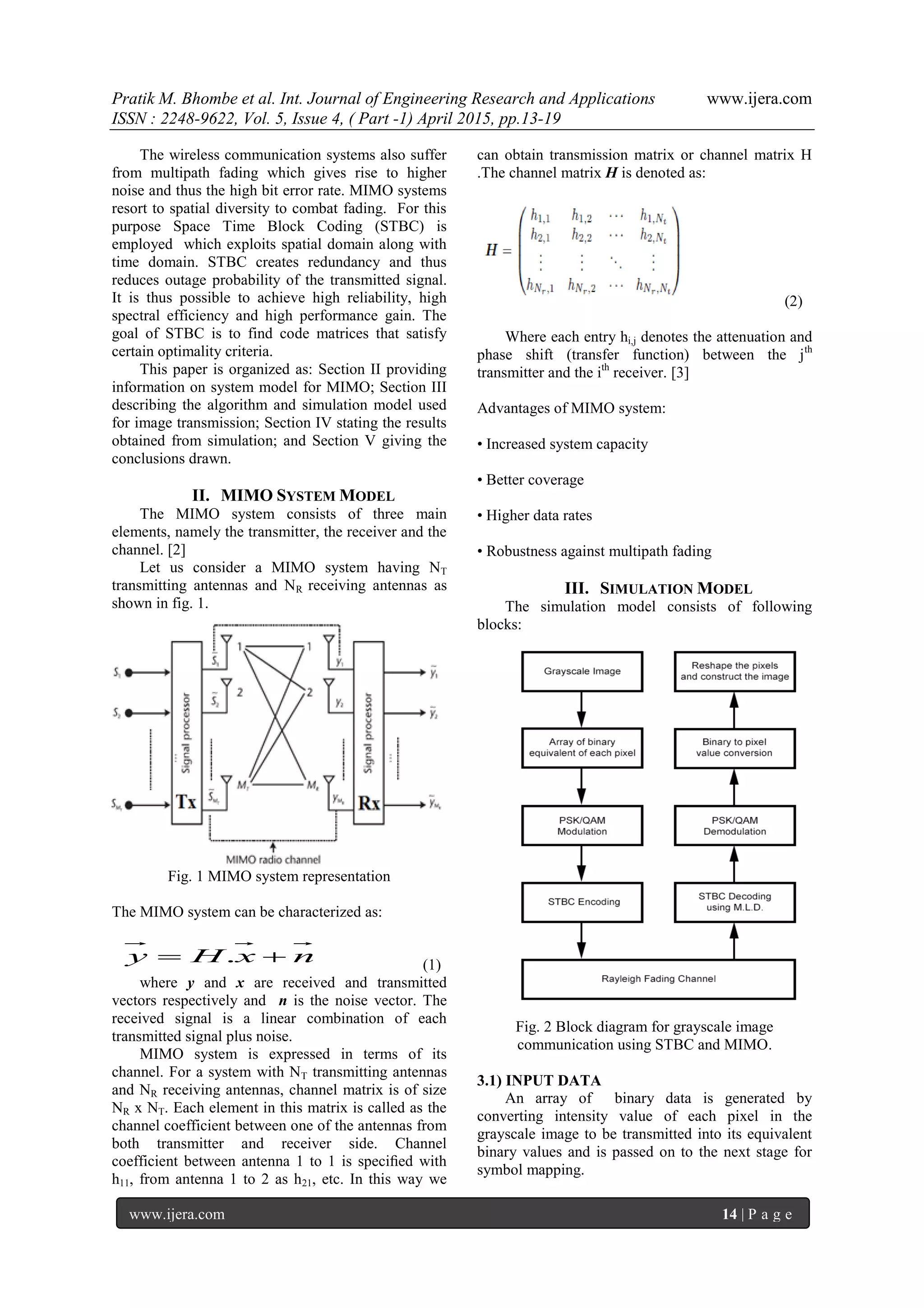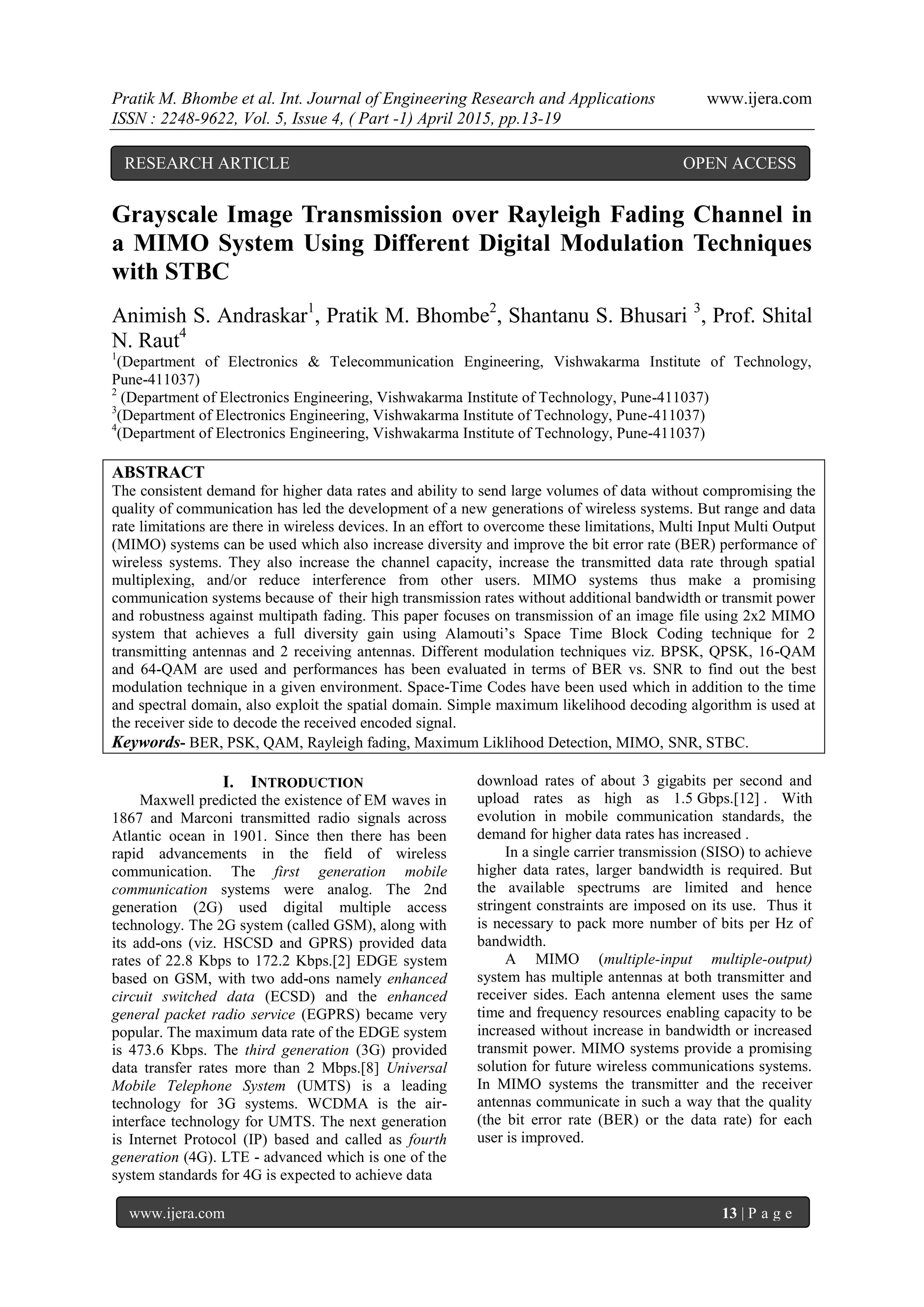 The document discusses grayscale image transmission over a Rayleigh fading channel using a 2x2 MIMO system and various digital modulation techniques, including BPSK, QPSK, 16-QAM, and 64-QAM, focusing on enhancing bit error rate (BER) performance. It explains the use of Alamouti's space-time block coding for achieving diversity gain, and evaluates the effectiveness of different modulation methods in terms of BER against signal-to-noise ratio (SNR). The findings indicate significant improvements in transmission quality through MIMO systems, which can effectively combat multipath fading and enhance data rates without increasing bandwidth or transmit power.