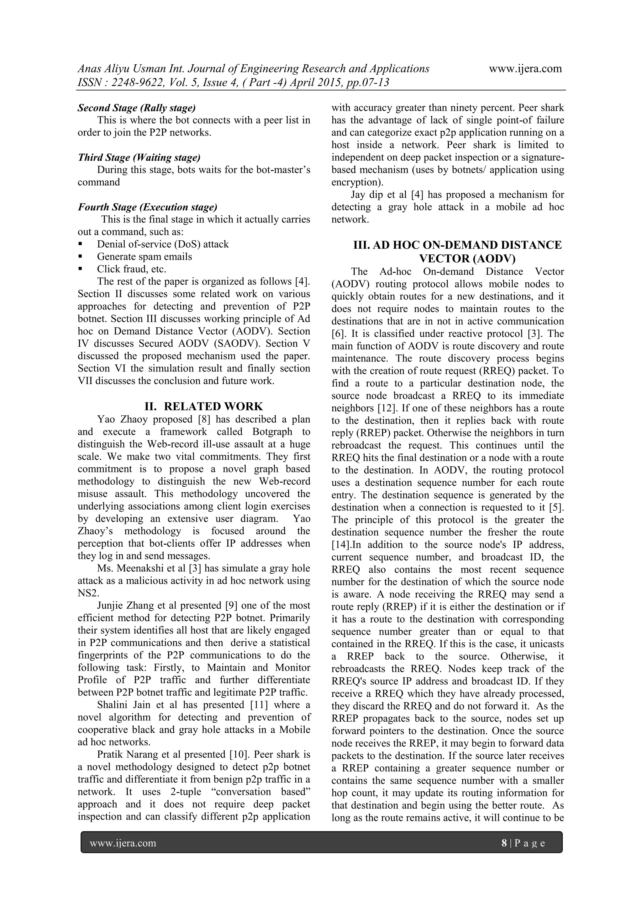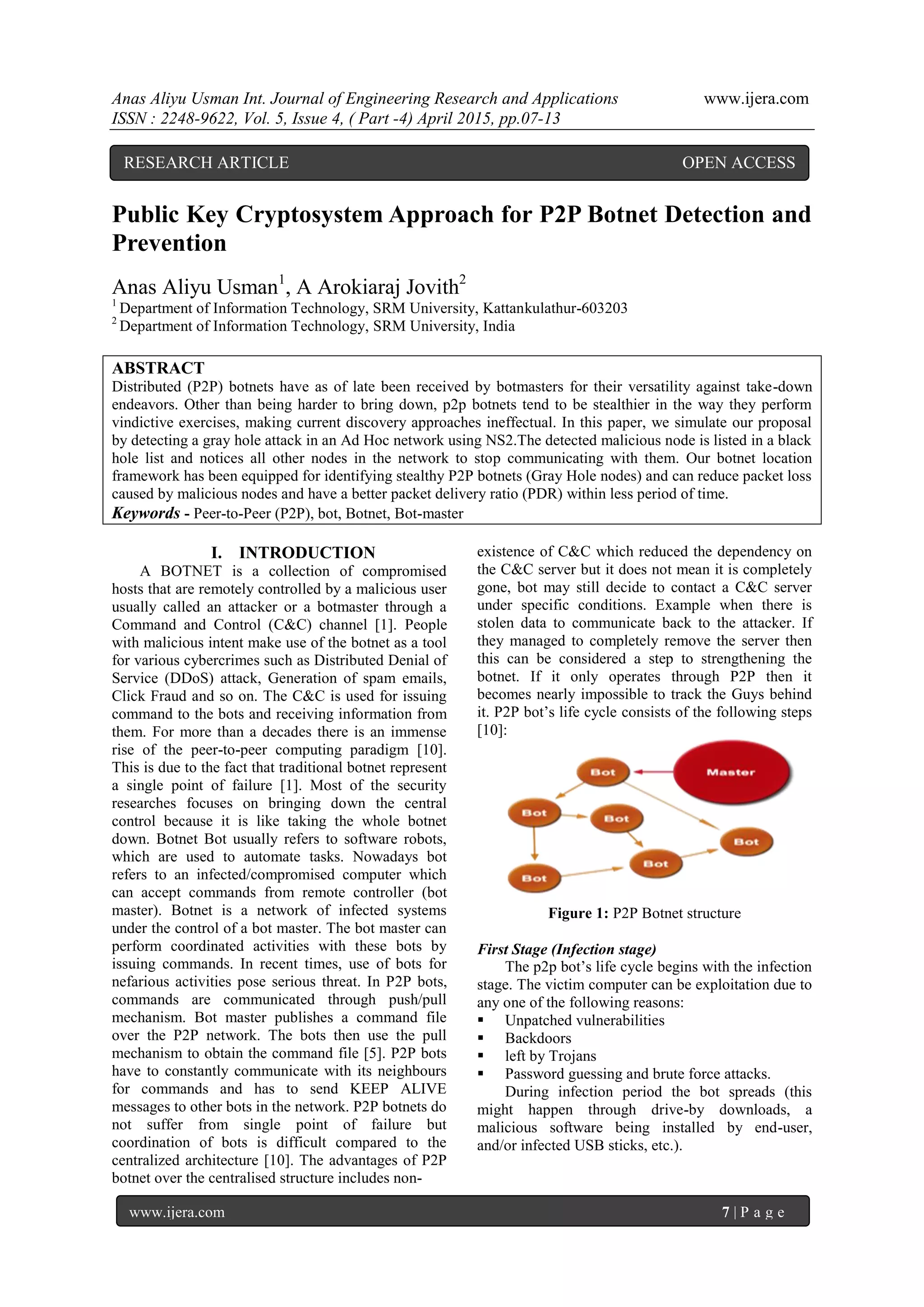 The document discusses a public key cryptosystem approach for detecting and preventing peer-to-peer (P2P) botnets, which are noted for their resilience and stealth in malicious activities. It proposes a framework that simulates the detection of gray hole attacks in mobile ad hoc networks using NS2, enhancing security and improving packet delivery ratios by identifying and isolating malicious nodes. The research also emphasizes the application of the RSA algorithm for secure node verification, contributing to more effective management of botnet threats in distributed networks.