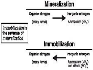 This document discusses organic matter decomposition in soil. It begins by outlining the key topics to be covered, including the decomposition process, factors affecting it, microorganisms involved, and plant nutrient cycles. It then covers properties of soil, the major microorganism groups in soil, essential plant nutrients and their sources in soil, and the basic plant nutrient cycle. Finally, it discusses decomposition of organic matter in depth, including the decomposers, the three processes of decomposition, and factors like temperature, moisture, pH, and carbon-nitrogen ratios that influence the rate of decomposition.