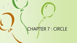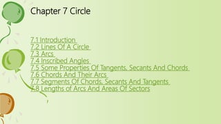 Chapter 7 focuses on circles, outlining their definitions, properties, and various related concepts such as lines, arcs, angles, chords, and tangents. Key topics include the classification of lines related to circles, the relationship between inscribed angles and arcs, properties of tangents and secants, as well as theorems related to chords and their measures. Exercises and examples throughout the chapter reinforce the foundational geometric principles associated with circles.