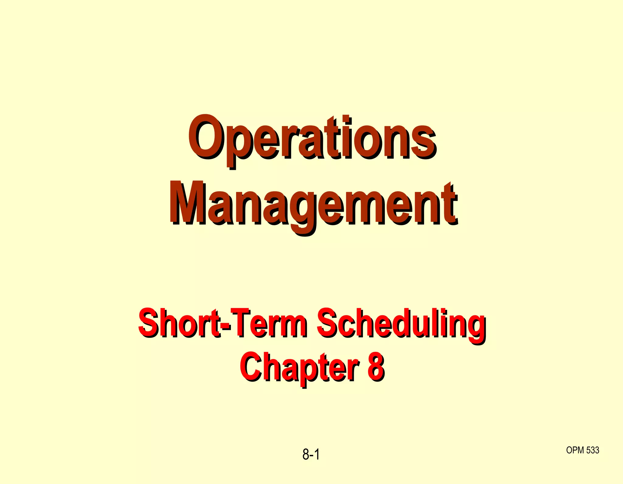 The document discusses various concepts and techniques related to short-term scheduling operations management. It covers topics like capacity planning, aggregate scheduling, master scheduling, forward and backward scheduling, scheduling criteria, sequencing rules, priority dispatching, bottleneck identification and management, and finite capacity scheduling. The goal of scheduling is to optimize resource use so that production objectives are met.