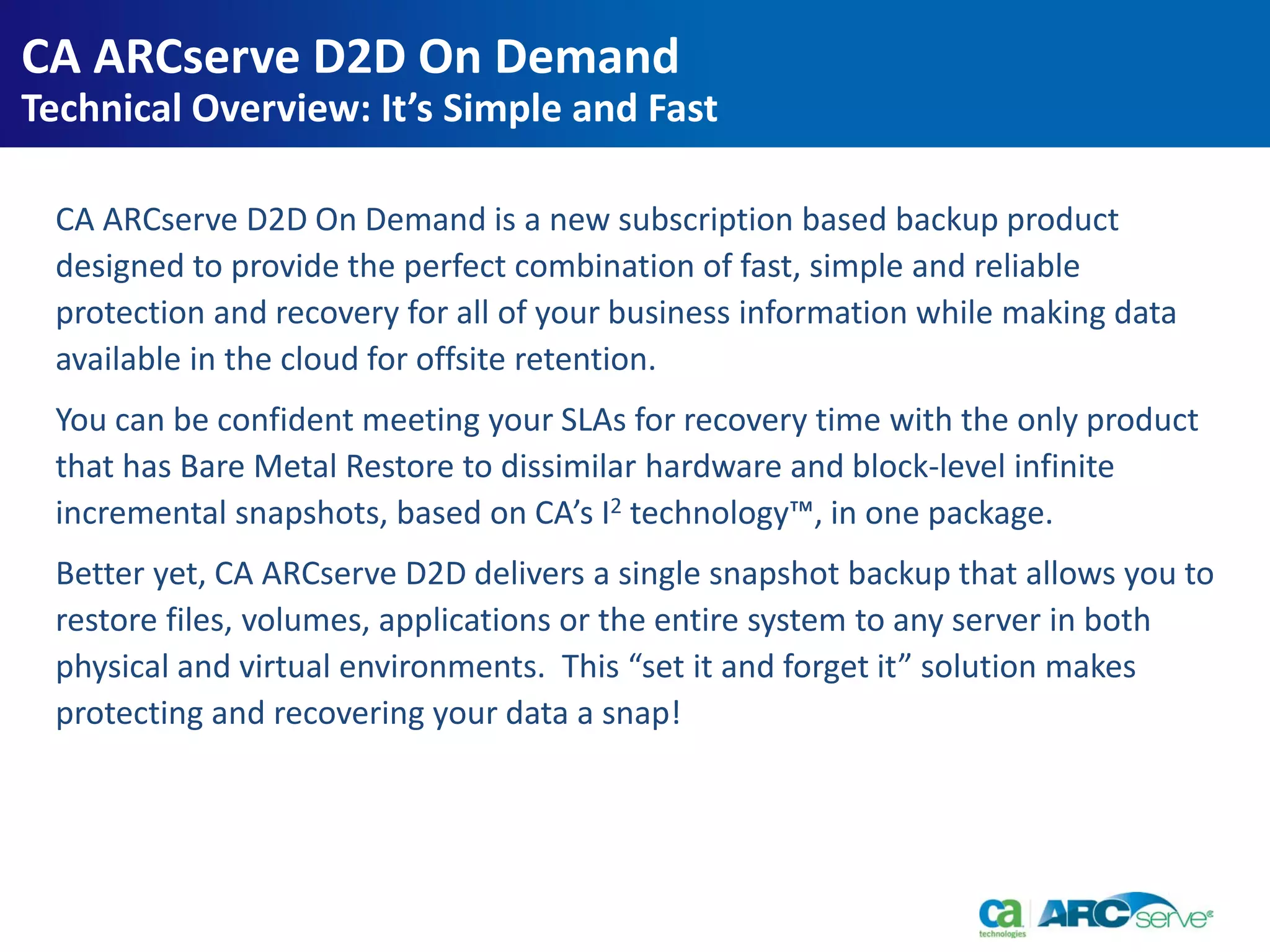 CA ARCserve D2D On Demand is a subscription-based backup product that provides fast, simple, and reliable protection for business data. It uses block-level infinite incremental snapshots and bare metal restore to dissimilar hardware to meet recovery time objectives. A single snapshot backup allows restoration of files, volumes, applications, or the entire system. The "set it and forget it" solution makes data protection and recovery easy.