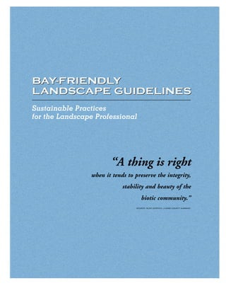 This document provides guidelines for environmentally friendly landscaping practices. It is organized around seven principles: 1) Landscape Locally, 2) Landscape for Less to the Landfill, 3) Nurture the Soil, 4) Conserve Water, 5) Conserve Energy, 6) Protect Water & Air Quality, and 7) Create & Protect Wildlife Habitat. For each principle, it lists specific practices and applications. The goal is for landscape professionals to consider these practices to design, construct, and maintain landscapes in a sustainable way that preserves natural resources and reduces waste.