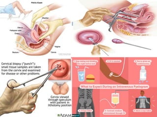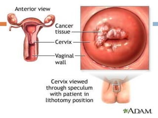 This document outlines the learning objectives related to cervical cancer (ca-cervix), covering its definition, etiology, pathophysiology, stages, clinical features, diagnostic evaluations, and management strategies. Cervical cancer is primarily a squamous cell carcinoma affecting women, with risk factors including socio-economic status, early sexual activity, and HPV infection. The management varies by stage and includes surgical options, radiotherapy, and nursing care to address patient concerns and promote recovery.