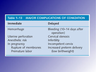 - Early lesions are treated with LEEP or conization. Advanced invasive cancers are staged surgically with radical hysterectomy and may involve chemotherapy or radiation if disease has spread. Regular screening can