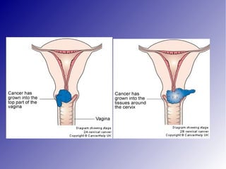 - Evaluation involves Pap smear, colposcopy if abnormal Pap, and biopsy for diagnosis. Staging includes physical exam, imaging like CT/MRI, and FIGO clinical staging.