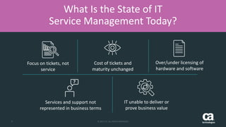 The document discusses challenges facing IT departments, including an inability to prove business value, a focus on tickets over services, and over- or under-licensing of software and hardware. It then presents CA Service Management as a solution, highlighting its integrated service desk, asset management, and automation capabilities. These capabilities are designed to help IT departments successfully deliver the right services at the right cost while improving user productivity, satisfaction, and strategic business alignment.