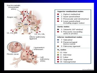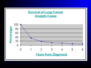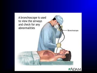 Lung cancer, also known as bronchogenic carcinoma, is a malignant tumor that originates in the lungs. It is the leading cause of cancer death worldwide. The main types are small cell lung cancer and non-small cell lung cancer. Symptoms may include cough, hemoptysis, dyspnea, and weight loss. Diagnosis involves imaging tests and biopsy. Treatment depends on the cancer type and stage, and may include surgery, chemotherapy, radiation therapy, or targeted therapy. Future areas of research focus on earlier detection, improved treatments, and prevention through reducing environmental carcinogens like tobacco smoke.