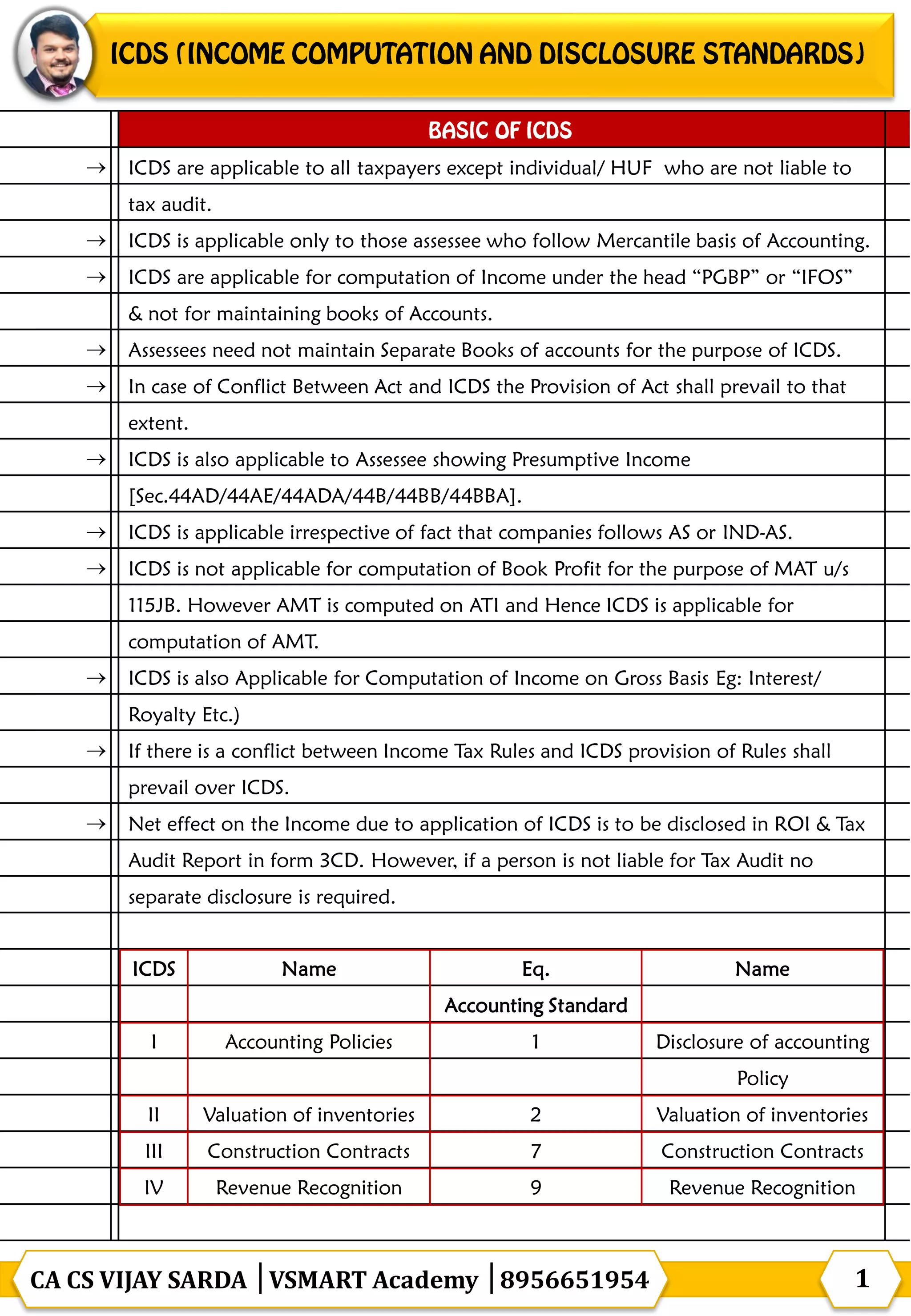 The document discusses the Income Computation and Disclosure Standards (ICDS) applicable to various taxpayers, including requirements for accounting policies, revenue recognition, inventory valuation, and treatment of foreign currency transactions. It emphasizes that while ICDS influences income computation, it does not dictate the maintenance of books of accounts and conflicts with existing laws favor the provisions of the Act. The document outlines specific ICDS names and their associated requirements, including disclosures for different categories of assets and liabilities.
