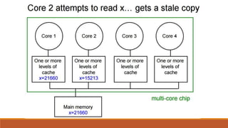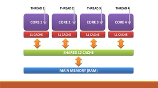 Multi-core processors have multiple processing units (cores) on a single chip to improve performance over single-core processors. As clock speeds became limited, chip designers added multiple cores to allow simultaneous execution of instructions. This achieves performance gains without increasing heat and power consumption. However, multi-core processors introduce new challenges around cache coherence and ensuring software is optimized for parallel execution across multiple cores. Future multi-core designs may include heterogeneous cores specialized for different tasks to further improve efficiency.