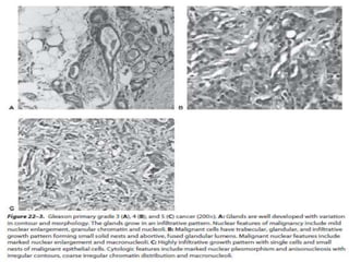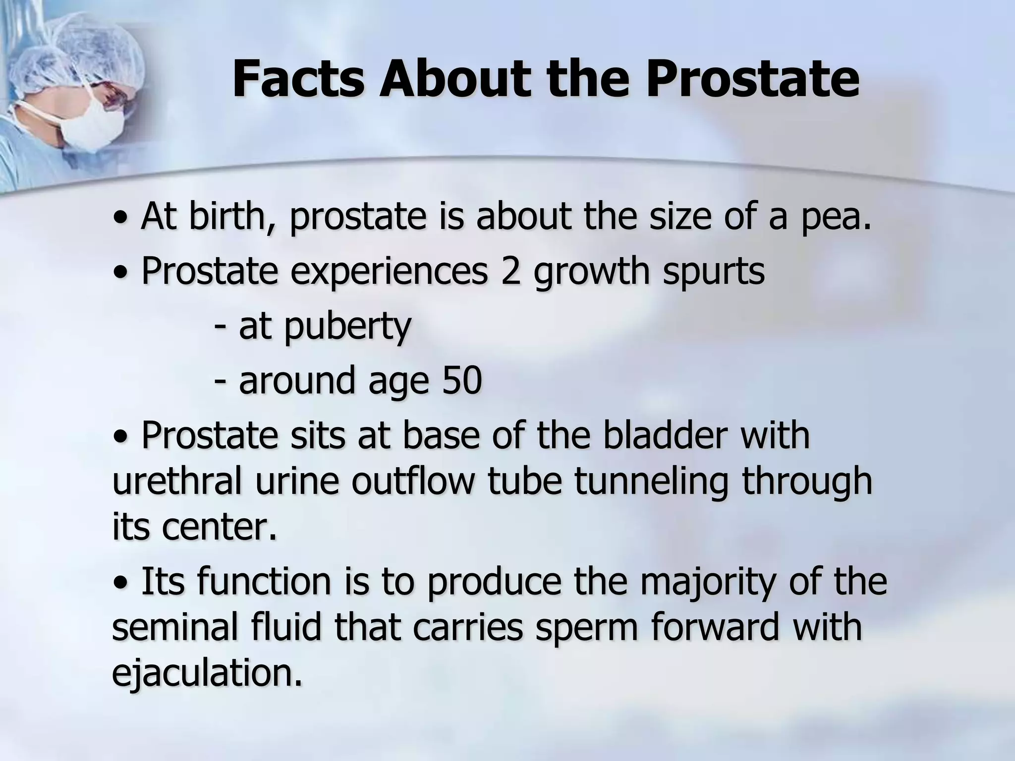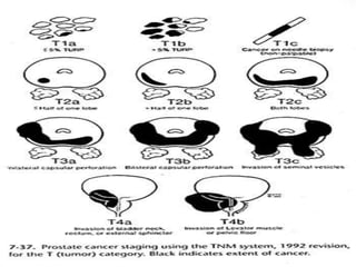 The document provides information on the anatomy and function of the prostate gland. It discusses that the prostate sits at the base of the bladder and produces seminal fluid. It grows during puberty and again around age 50. The document also covers prostate zones, blood supply, lymphatic drainage and common presentations of prostate cancer such as elevated PSA levels or urinary symptoms. Prostate cancer risk factors, diagnosis using PSA, digital rectal exam and biopsy are summarized. Staging of prostate cancer is discussed including the TNM system and Gleason grading scale.