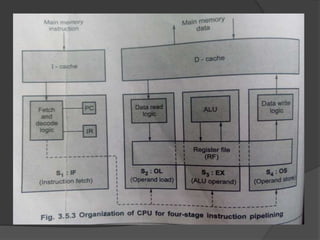 This document discusses the implementation of a basic MIPS processor including building the datapath, control implementation, pipelining, and handling hazards. It describes the MIPS instruction set and 5-stage pipeline. The datapath is built from components like registers, ALUs, and adders. Control signals are designed for different instructions. Pipelining is implemented using techniques like forwarding and branch prediction to handle data and control hazards between stages. Exceptions are handled using status registers or vectored interrupts.