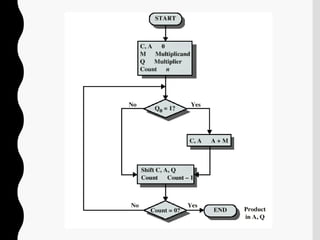 3) Multiplication is done using sequential or Booth's algorithm approaches while division uses restoring or non-restoring algorithms. Floating point uses similar addition and subtraction steps but first normalizes the exponents.