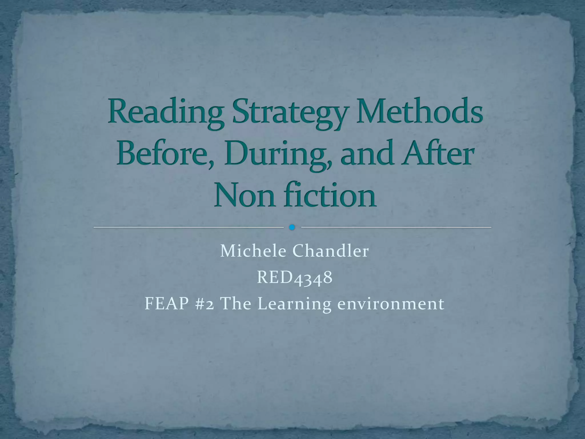 This document discusses strategies for creating an effective learning environment for reading non-fiction texts. It outlines several strategies including using a smart chart, think-pair-share, previewing text, pre-teaching vocabulary, and making connections. Additional strategies covered are graphic organizers, marking text, logograph cards, saying something while reading in groups, and creating custom bookmarks. The document also discusses comprehension checks, exit slips, RAFT writing assignments, Twitter summaries, and oral reports to assess student understanding of texts.