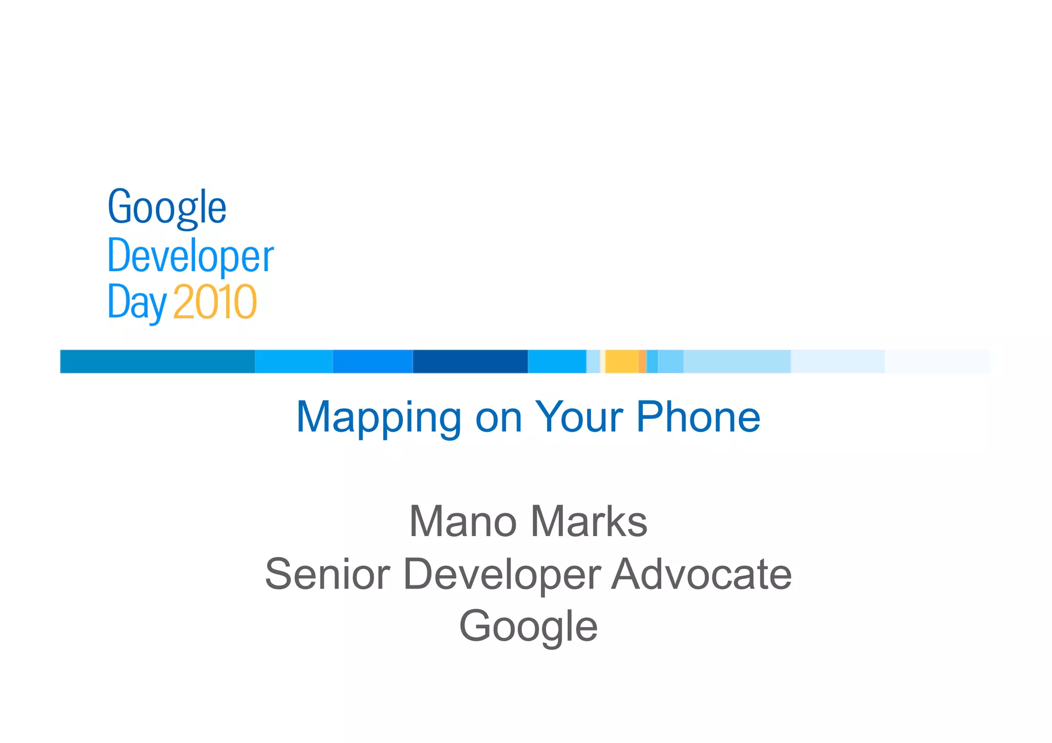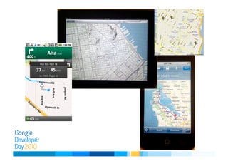 The document provides an overview of mobile mapping options using Google APIs, including browser-based, native, and hybrid methods. It details features such as KML layers, HTML5 geolocation, and various development paths across platforms like iPhone and Android. Additionally, it discusses optimizations for user experience and provides sample code for implementation.