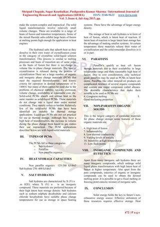 This document discusses the use of phase change materials (PCMs) for storing solar thermal energy. PCMs can store large amounts of heat without a large temperature change when melting and releasing heat during solidification. Common PCMs include salt hydrates, paraffins, and non-paraffin organics. PCMs provide advantages over sensible heat storage materials like higher energy density and ability to store and release heat isothermally. The document explores different types of PCMs and their heat storage capacities, concluding that PCMs are a wise alternative for solar energy storage applications.