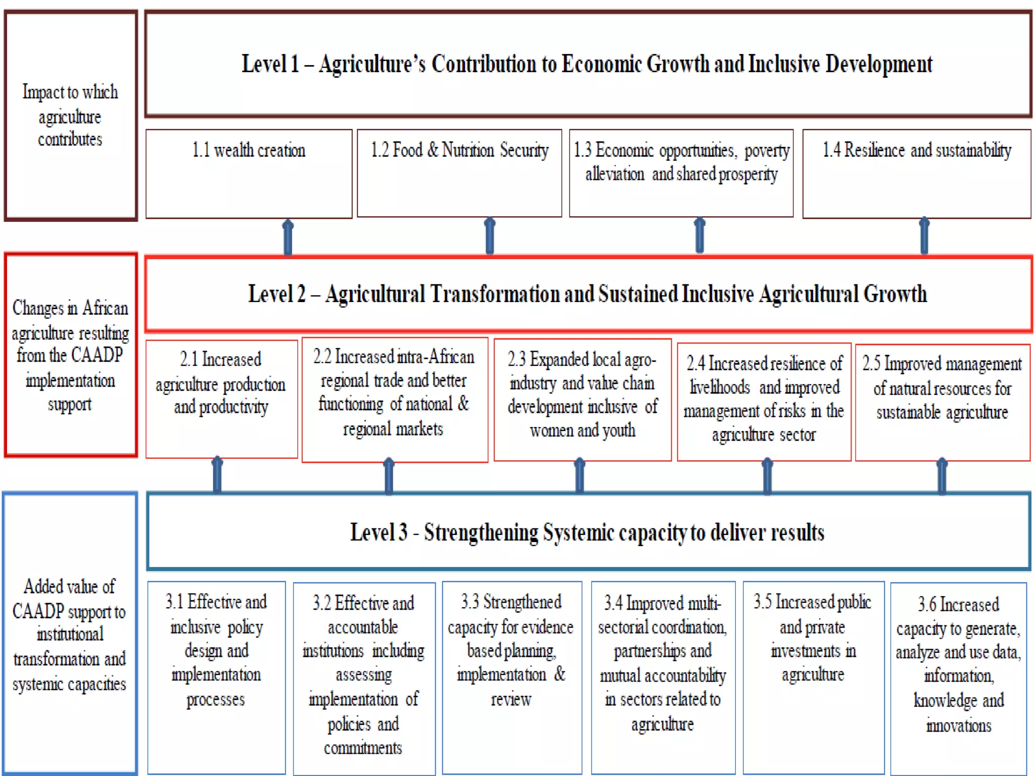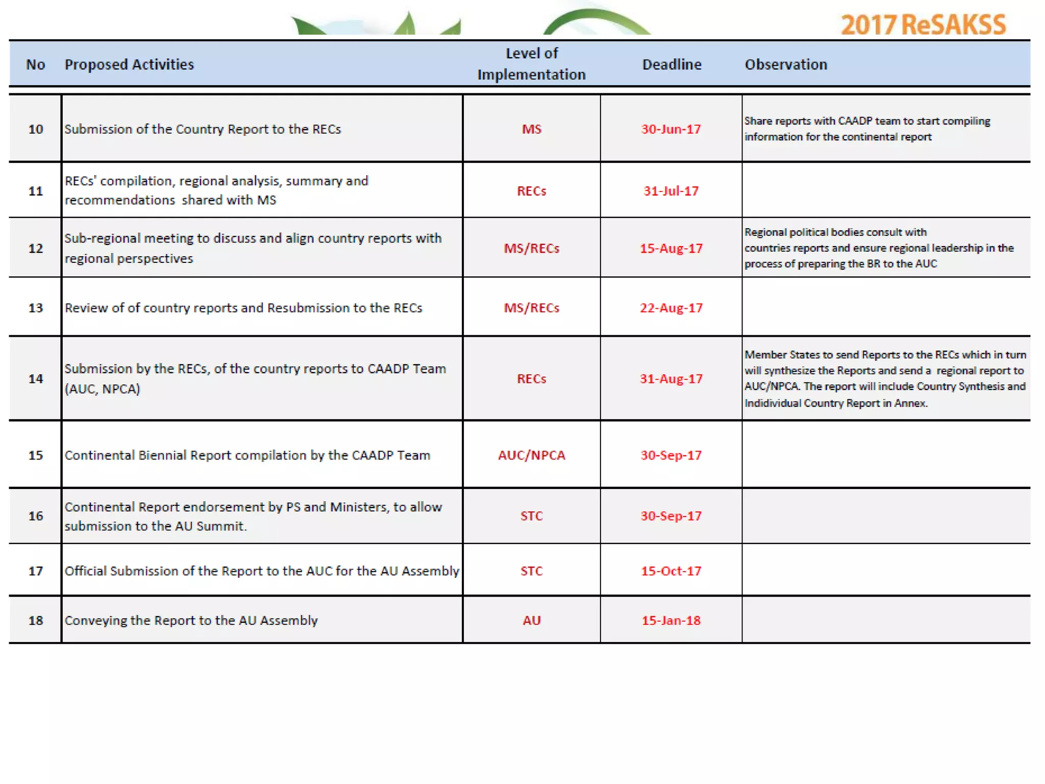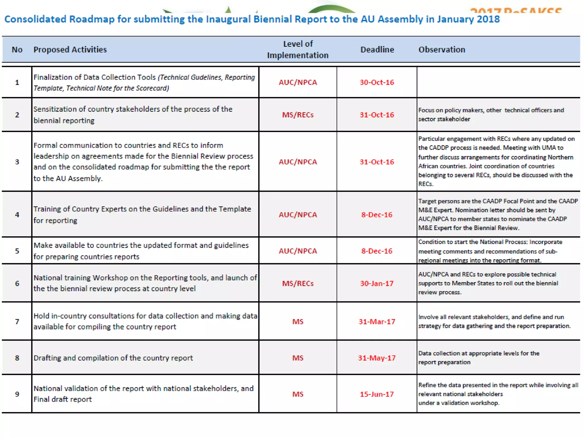The document outlines the CAADP Biennial Review process, highlighting commitments made in the Malabo Declaration, including enhancing investment in agriculture and ending hunger by 2025. Progress has been made in training stakeholders across various African regions, and numerous country reports have been submitted and analyzed. The document also discusses next steps for presenting findings and operationalizing recommendations to support member states in achieving these commitments.