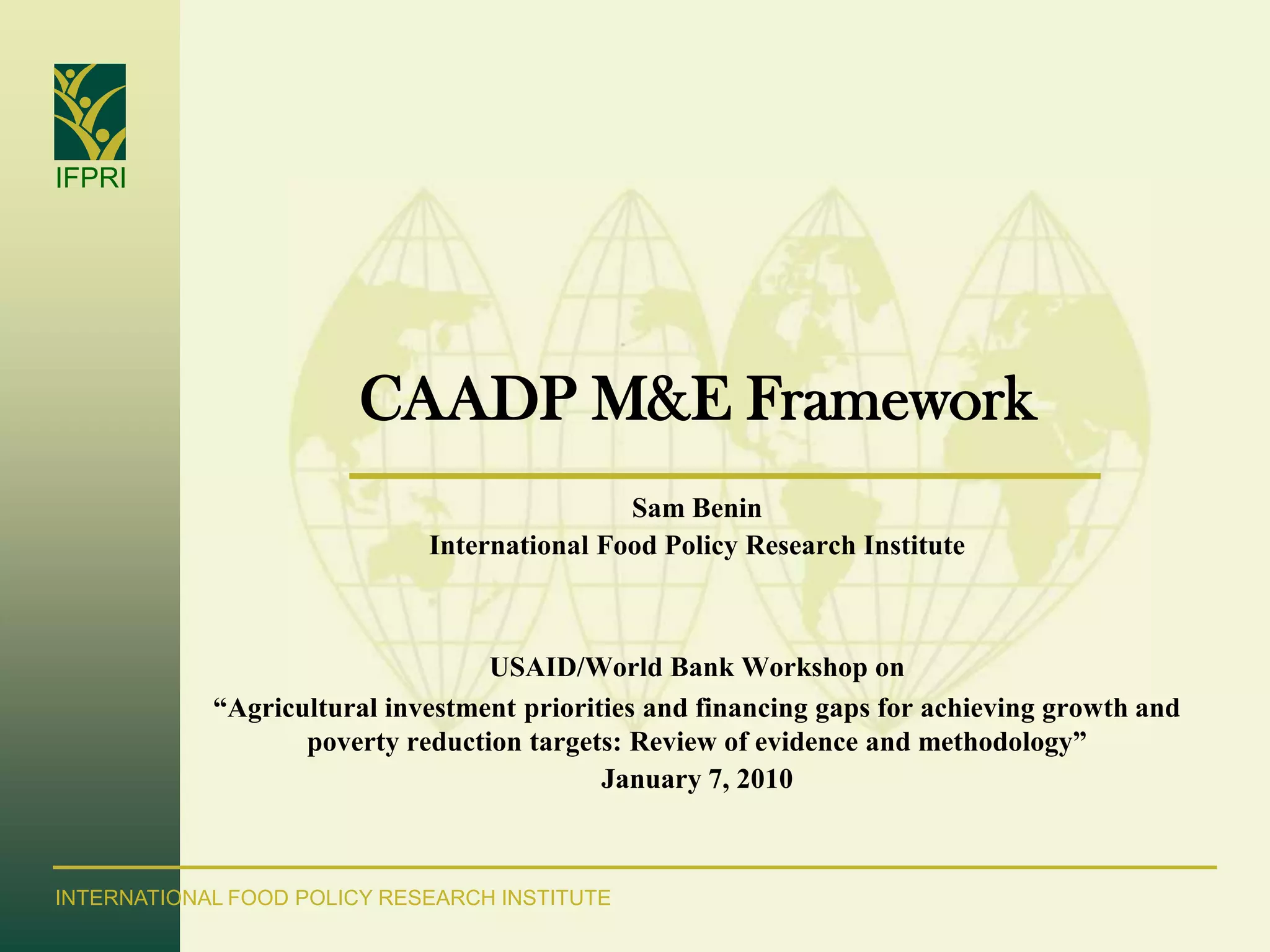 The document outlines the need for a Common Monitoring and Evaluation (M&E) framework under the CAADP to assess progress towards agricultural growth and poverty reduction targets in Africa. It details the key activities, indicators, and analyses being employed to measure effectiveness and impact in agricultural investments across multiple levels. The document also discusses dissemination efforts and the importance of continuous improvement in M&E practices to enhance policy outcomes and investments in agriculture.