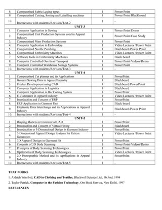 This document outlines a lesson plan to impart knowledge on computer applications in the apparel industry. The objectives are to understand CAD systems and software tools used in apparel design, and apply CAD knowledge to efficient product development and portfolio building. The plan covers 5 units: introduction to computer basics and CAD/CAM systems; CAD for textile design, pattern making and grading; computer applications in sewing, mass production and embroidery; CAD for product development, logistics and e-commerce; and 3D design, virtual fitting and body scanning.