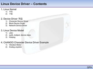 - 일반적으로 문자, 블록, 네트워크 디바이스 드라이버로 분류 하며 ―/dev‖에 나타난다.