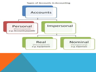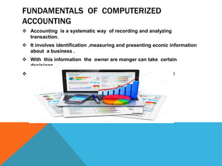 The document discusses the fundamentals of computerized accounting versus manual accounting. It explains that accounting involves systematically recording and analyzing transactions to present economic information about a business to owners and managers. This can be done through computerized accounting or manually. The principles of accounting involve recording transactions in journals and ledgers to classify accounts for individuals, properties, expenses/incomes. Computerized accounting digitizes this process for easier recording and analysis of accounting information compared to manual accounting methods.