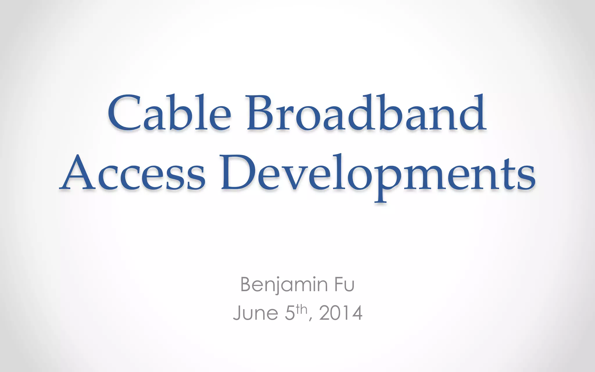 This document summarizes recent developments in cable broadband access technologies. It discusses the evolution of DOCSIS standards, including the new DOCSIS 3.1 specification which uses OFDM and OFDMA to achieve multi-gigabit speeds while maintaining backwards compatibility. It also covers the CCAP converged cable access platform and distributed architectures like remote PHY. Finally, it outlines one vendor's strategy of focusing on DOCSIS 3.1 CPE and leveraging strengths in related technologies like EPON/GPON as the cable industry transitions to new standards.