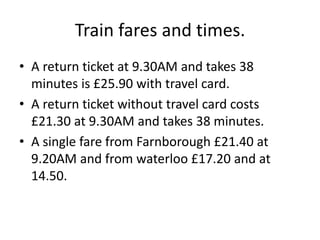 The document provides information about train fares and times for travel between Farnborough and Waterloo, as well as prices and hours of operation for the Emirates Airline cable car between Royal Docks and Greenwich. A return train ticket with a travel card from Farnborough to Waterloo is £25.90 and takes 38 minutes, while a single fare without a travel card from Farnborough is £21.40 and from Waterloo is £17.20. Single and return journeys on the cable car range between £4.30-£8.60 for adults and £2.20-£4.40 for children. The cable car operates daily from 7am to 8 or 9pm depending on the day of the