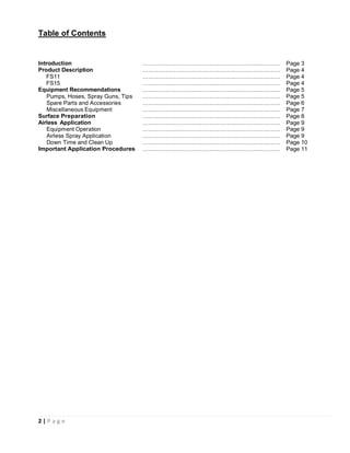 - Recommendations for airless spray equipment, pumps, hoses, guns and tips for proper application.