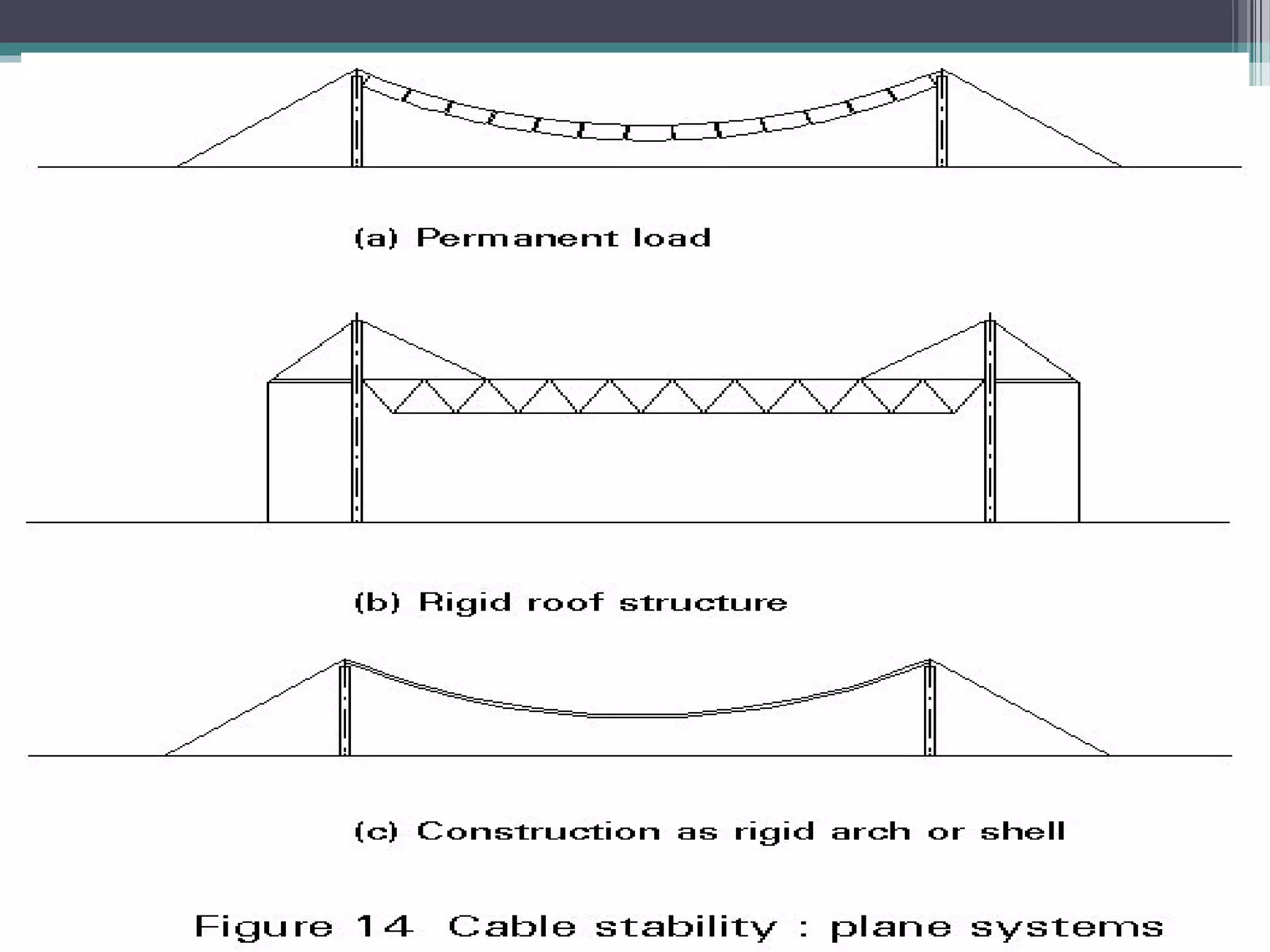 The document discusses cable structures and their role as form-active systems that transmit loads through tension and compression. It highlights the design considerations, advantages, and limitations of cable systems, including their adaptability to loads, stability issues, and applications in modern architecture such as sports arenas and bridges. The importance of materials, particularly steel, and structural elements in optimizing cable systems for large spans is also emphasized.
