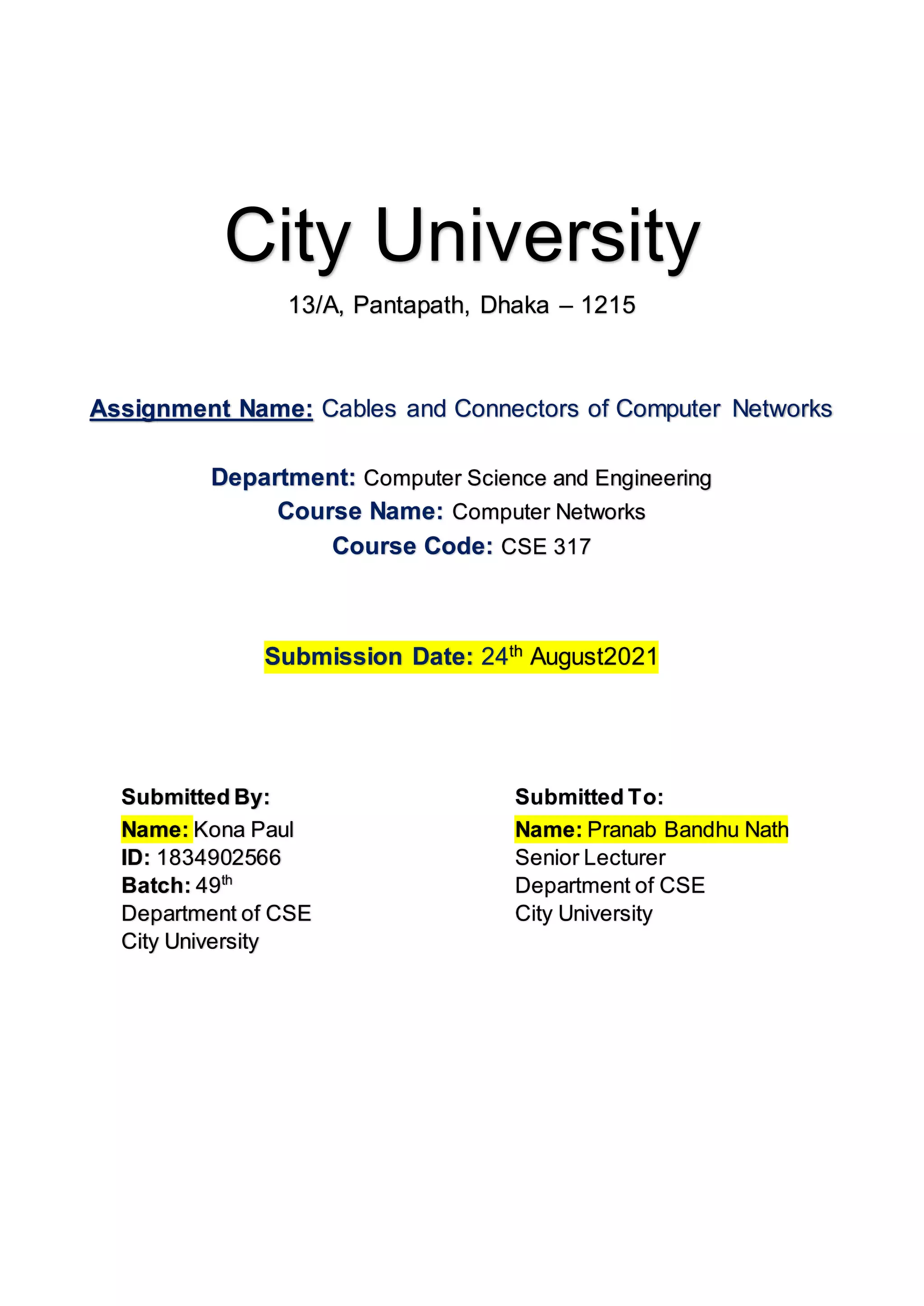 The document provides a detailed overview of various types of cables and connectors used in computer networks, including twisted pair, coaxial, and fiber optic cables. It explains the characteristics and applications of each cable type, emphasizing their differences in terms of data transmission capabilities, installation complexity, and use cases. Additionally, it mentions wiring standards and connector types commonly associated with networking, such as RJ-45 connectors for twisted pair cables.