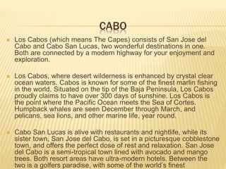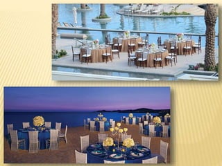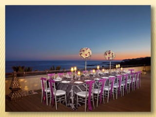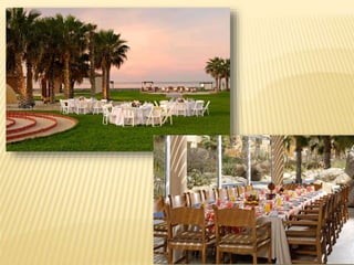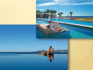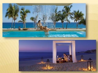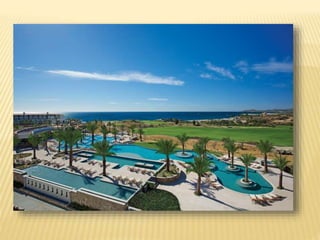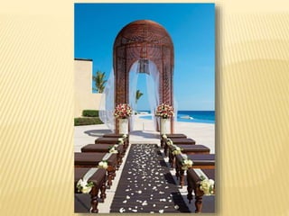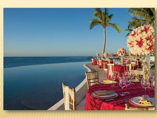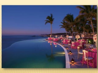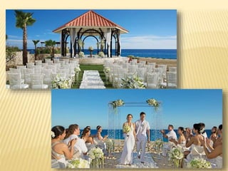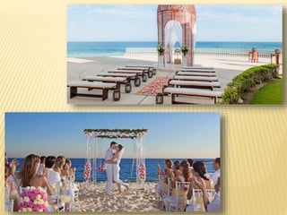 The document provides information about destination weddings at two resorts in Los Cabos, Mexico: Secrets Marquis Los Cabos and Pueblo Bonito Pacifica. Both are all-inclusive luxury resorts for adults only, located on the beach with ocean views. Secrets Marquis has suites and amenities like pools, restaurants and a spa. Pueblo Bonito Pacifica also offers pools, dining options and access to amenities at nearby Pueblo Bonito properties. Both resorts offer wedding packages and accommodations for couples looking to wed in Los Cabos.