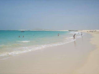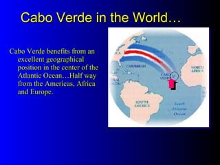 Cabo Verde is an archipelago located in the Atlantic Ocean between Africa, Europe, and the Americas. It benefits from its central location and tropical climate. The document discusses Cabo Verde's history including early Portuguese exploration in the 15th century. It highlights aspects of Cabo Verde's culture like music, poetry, festivals, and independence in 1975. Tourism is a key part of the economy with over 200,000 visitors annually, mainly from Europe, enjoying the beaches, seas, and volcanic landscapes.