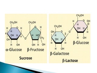Carbohydrates originate from photosynthesis in plants. They serve several functions in plants and animals including energy storage, structure, and participating in biochemical processes. Carbohydrates are classified based on their size as monosaccharides, oligosaccharides, or polysaccharides. Monosaccharides are the simplest form, oligosaccharides contain 2-10 monosaccharide units, and polysaccharides are long chains of many monosaccharide units. Common examples of each type are also provided.