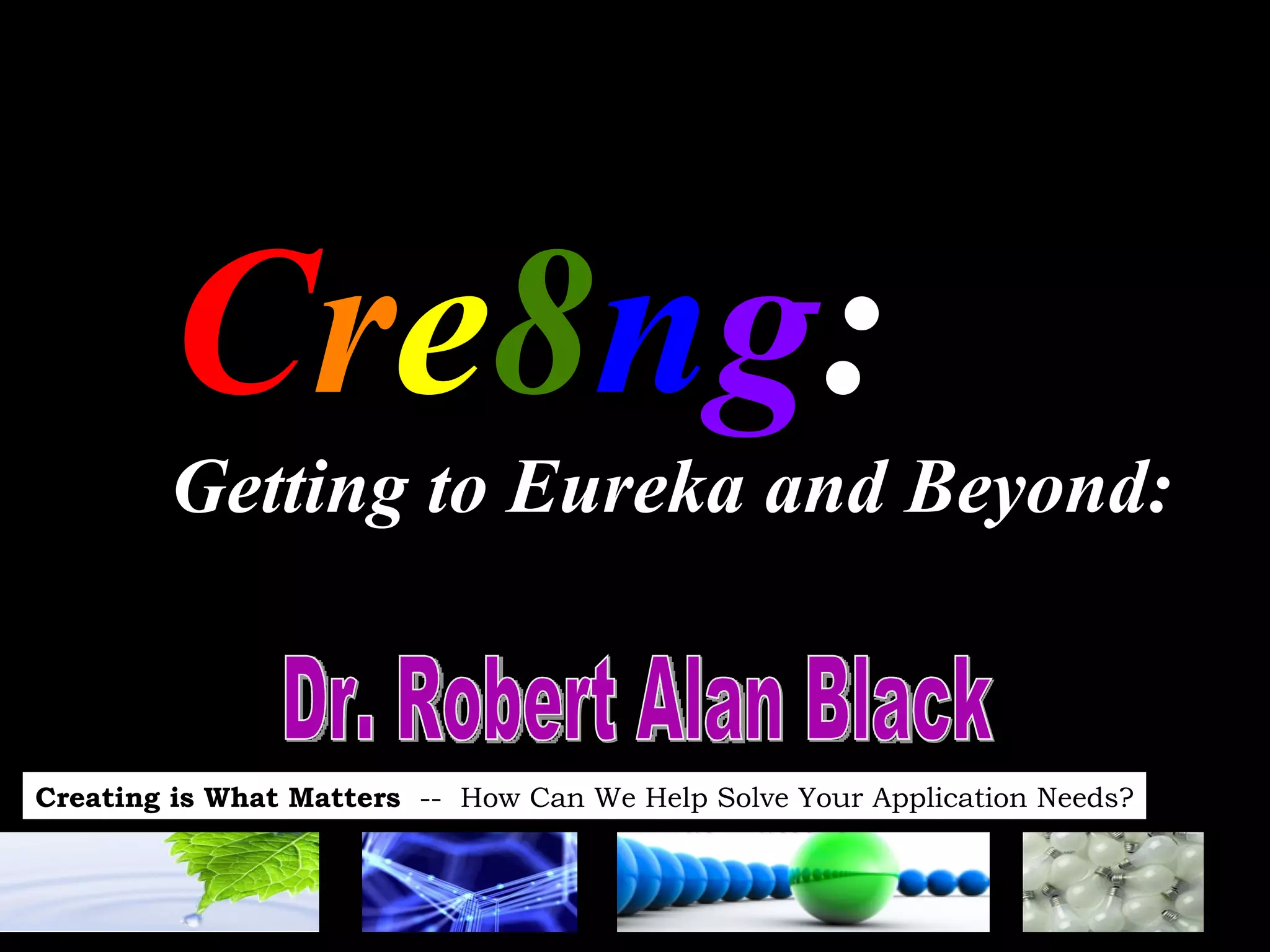 The document discusses the importance of creativity as a choice that can be fostered at individual, leadership, and organizational levels. It outlines various creative thinking traits, tools, and techniques to overcome creative blocks and enhance innovation. Key concepts include the use of divergent and convergent thinking tools, the S.C.A.M.P.E.R. checklist for idea generation, and various warm-up exercises to encourage creative thinking.