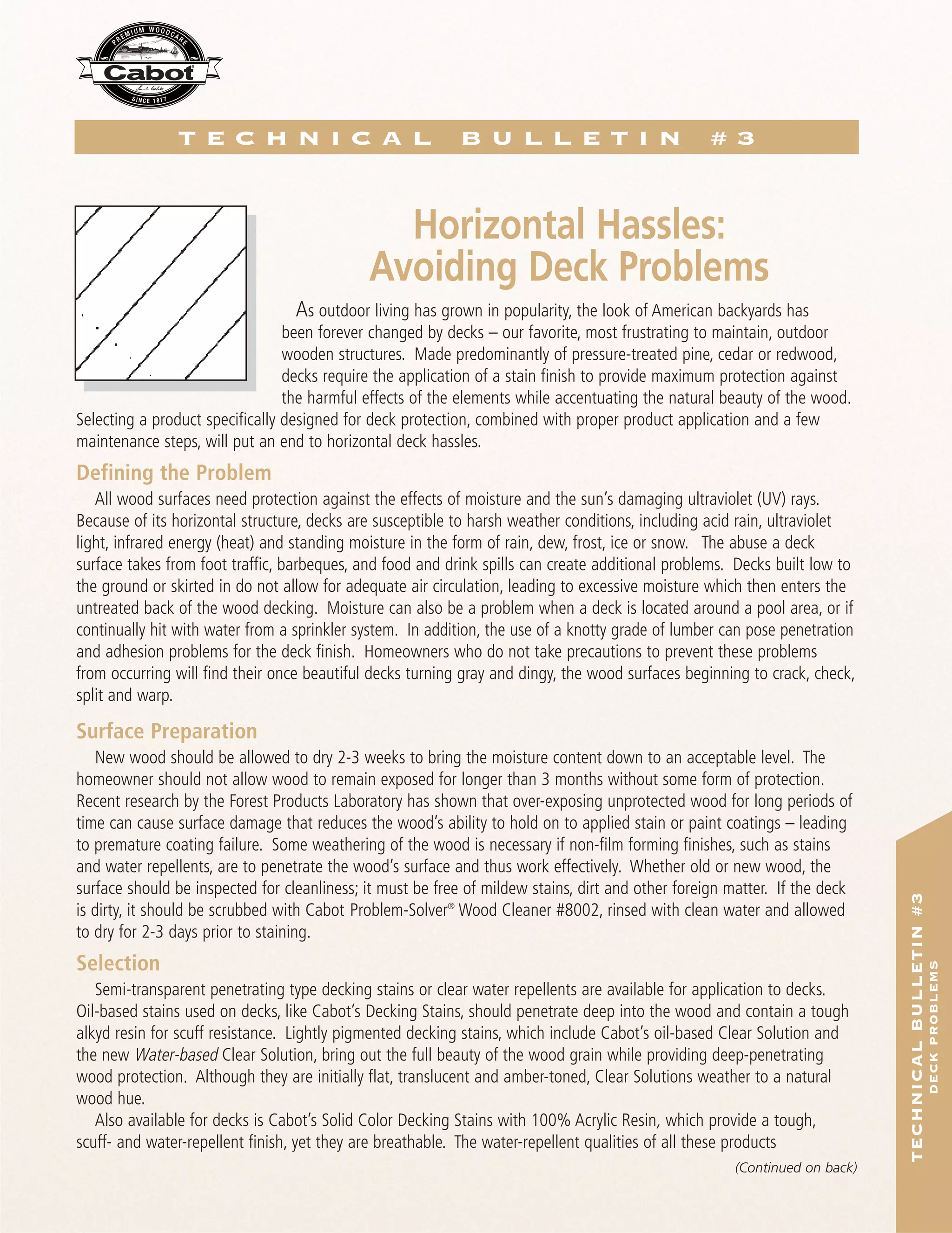 Decks require protection from moisture and UV rays to prevent damage. Selecting a penetrating stain designed for decks and properly applying it in dry conditions while avoiding over-application can protect the wood. Clear finishes need reapplication every 6 months to a year while pigmented stains last 2-4 years. Maintaining the finish is important to maximize the deck's beauty and longevity.