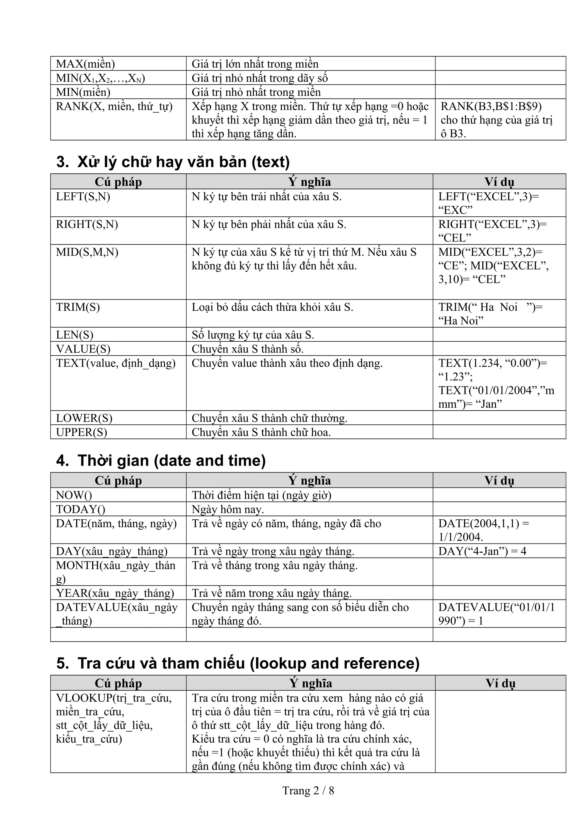 Tài liệu trình bày các hàm Excel thông dụng trong toán học, thống kê, văn bản, thời gian, tra cứu, tham chiếu và logic. Nó bao gồm cú pháp, ý nghĩa và ví dụ cụ thể cho từng hàm, như SUM, AVERAGE, VLOOKUP, và IF. Ngoài ra, tài liệu cũng đề cập đến cách thiết lập điều kiện trong Excel thông qua các hàm và chức năng lọc nâng cao.
