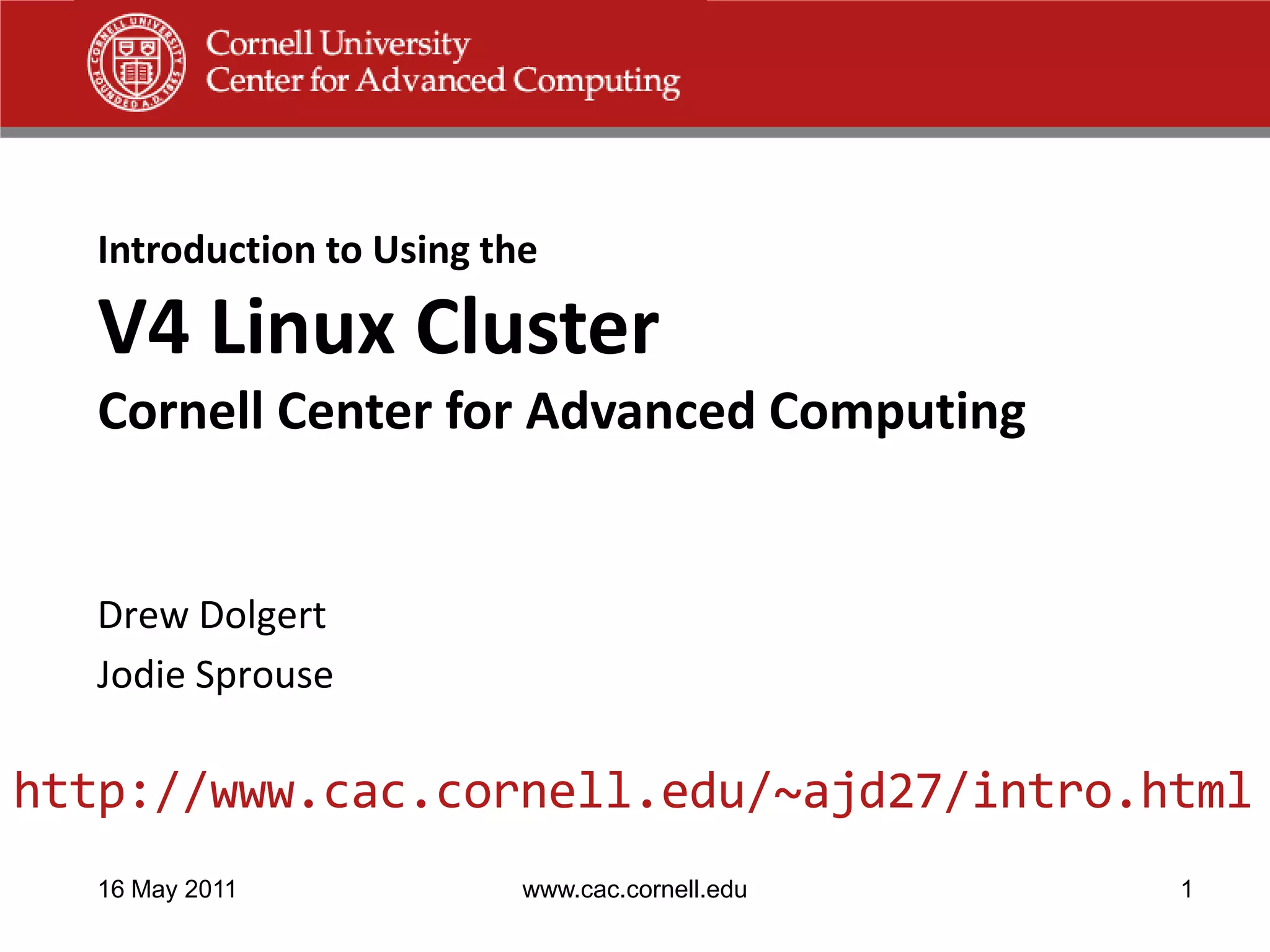This document provides an introduction to using the V4 Linux cluster at Cornell University. It explains how to connect to the login nodes, set up a home directory, transfer files, run programs interactively and in batch mode by submitting jobs to the scheduler. It also covers choosing queues, requesting resources like CPU time and disk space, managing jobs, and finding help resources. The goal is to help new users get started using the Linux cluster for their computational needs.