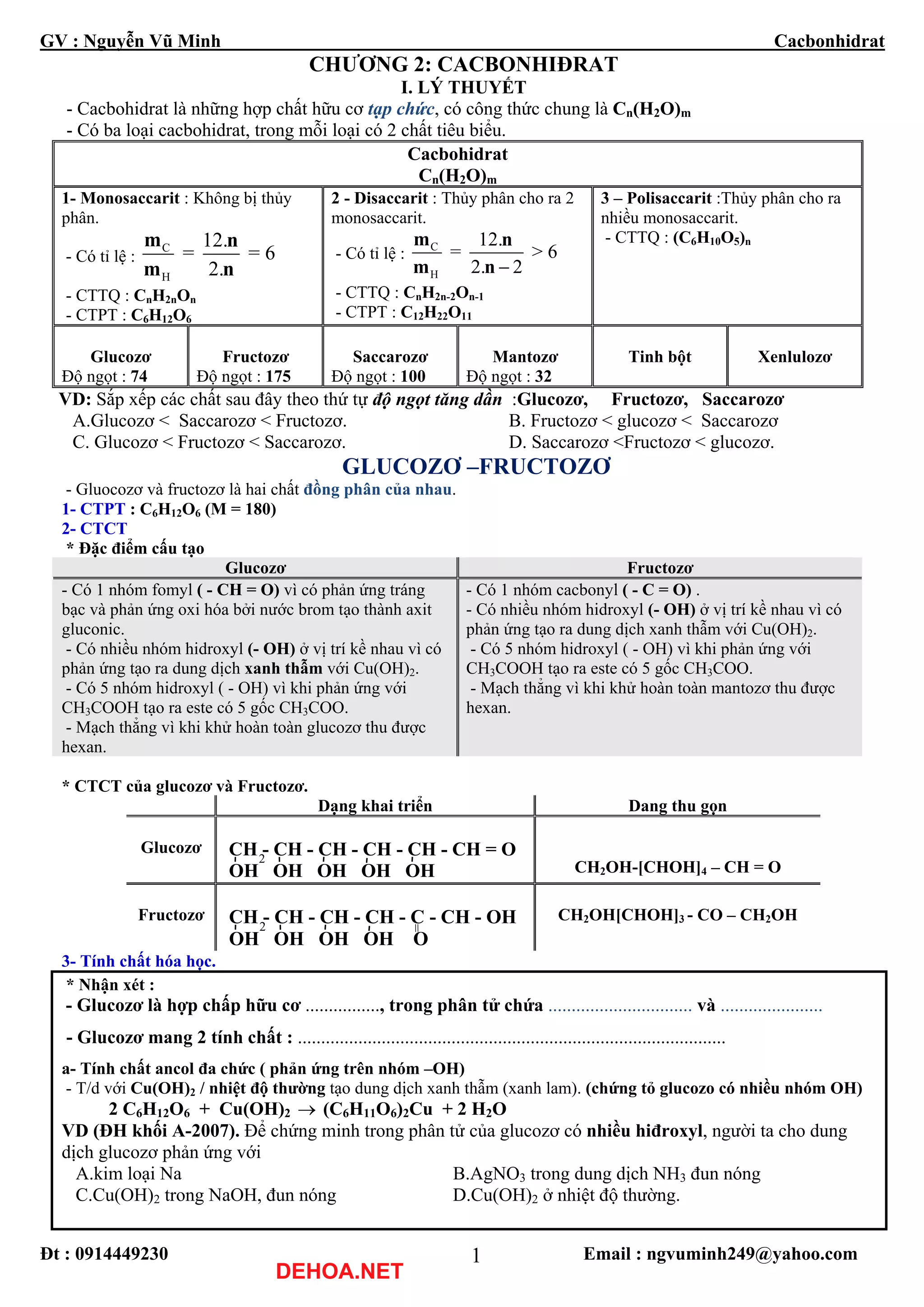 Tài liệu trình bày về cacbonhydrat, phân loại thành ba loại chính: monosaccarit, disaccarit và polisaccarit, cùng với đặc điểm của từng loại. Đặc biệt, glucozơ và fructozơ là hai đồng phân với cấu trúc và tính chất hóa học quan trọng, bao gồm khả năng tham gia vào phản ứng oxi hóa và khử. Tài liệu cũng đề cập đến một số phản ứng hóa học của saccarozơ và mantozơ, nhấn mạnh vai trò và cấu trúc của chúng trong hóa học.